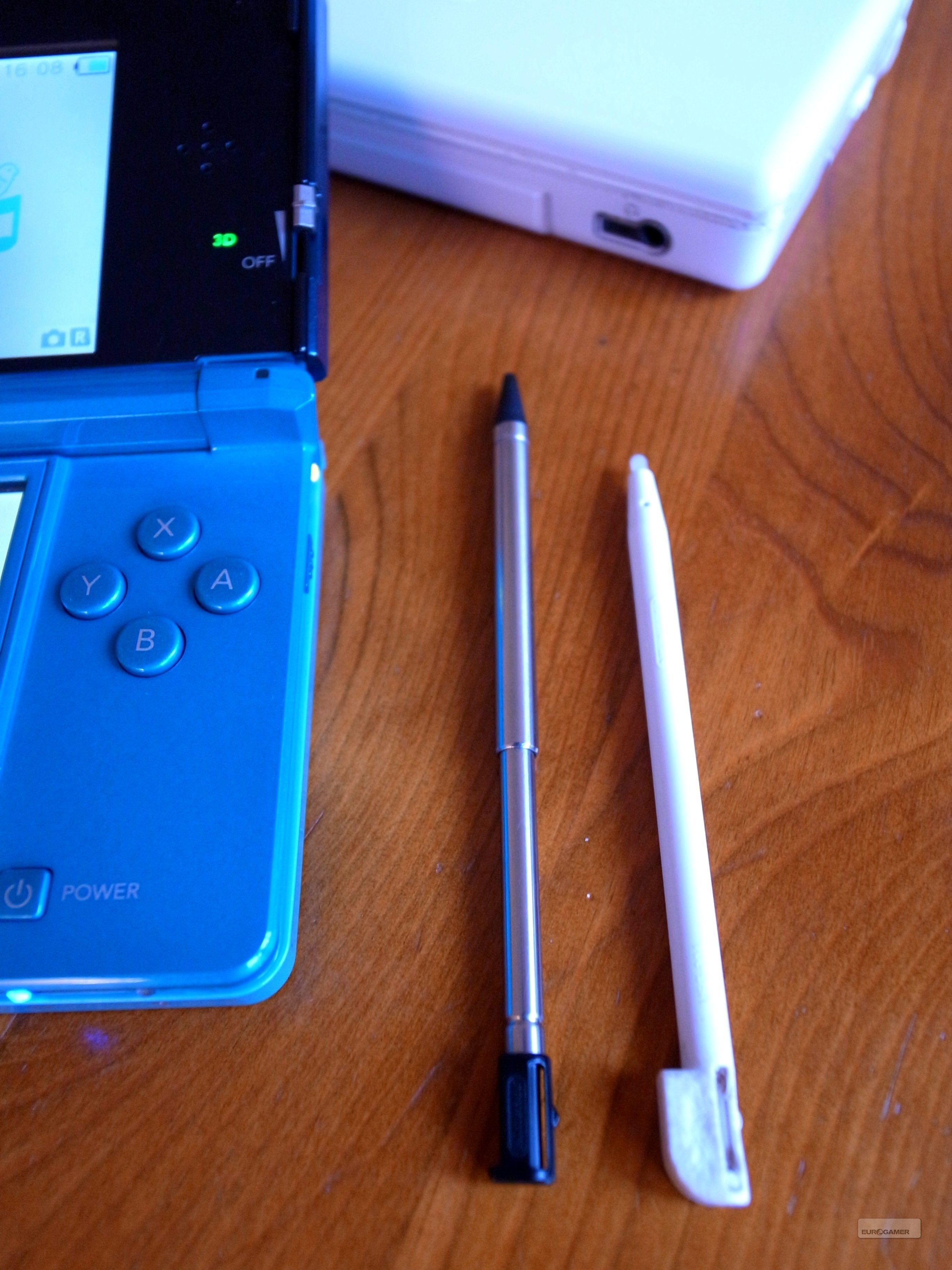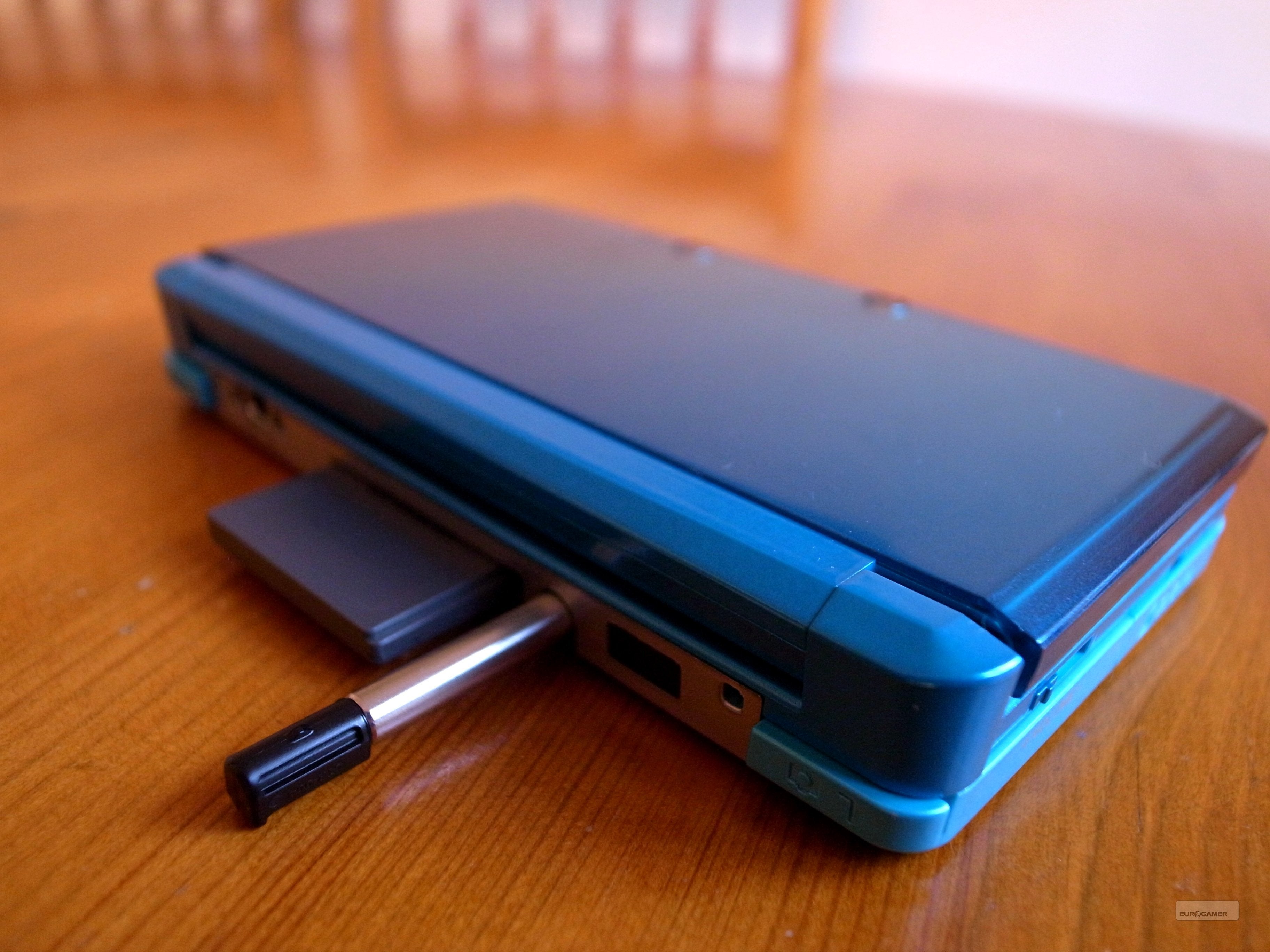 Wanneer we helemaal in het midden kijken vinden we de cardslot terug waarin de cardridges gestopt kunnen worden. Het gleufje is een tikkeltje breder dan die op andere DS-modellen, en dat komt doordat 3DS-cardridges aan hun rechterkant een vreemd hoekje hebben dat naar buiten uitsteekt. De 3DS slikt echter ook zonder problemen alle in het verleden uitgebrachte DS-spellen, dus maak je geen zorgen over de collectie die je tot nu toe al hebt weten te verzamelen. Natuurlijk kunnen DS-games niet in 3D weergegeven worden. Direct naast het gleufje zit de stylus verborgen. Het pennetje lijkt op het eerste zicht korter dan dat van voorgaande modellen, maar het is mogelijk om de basis langer te maken door eraan te trekken (ok, dat klonk lichtjes seksueel, onze excuses). Doe je dat, dan is de stylus langer dan die van de DSi, maar nog steeds even slank. Verwacht dus geen mastodont zoals je bij de DSiXL kreeg.