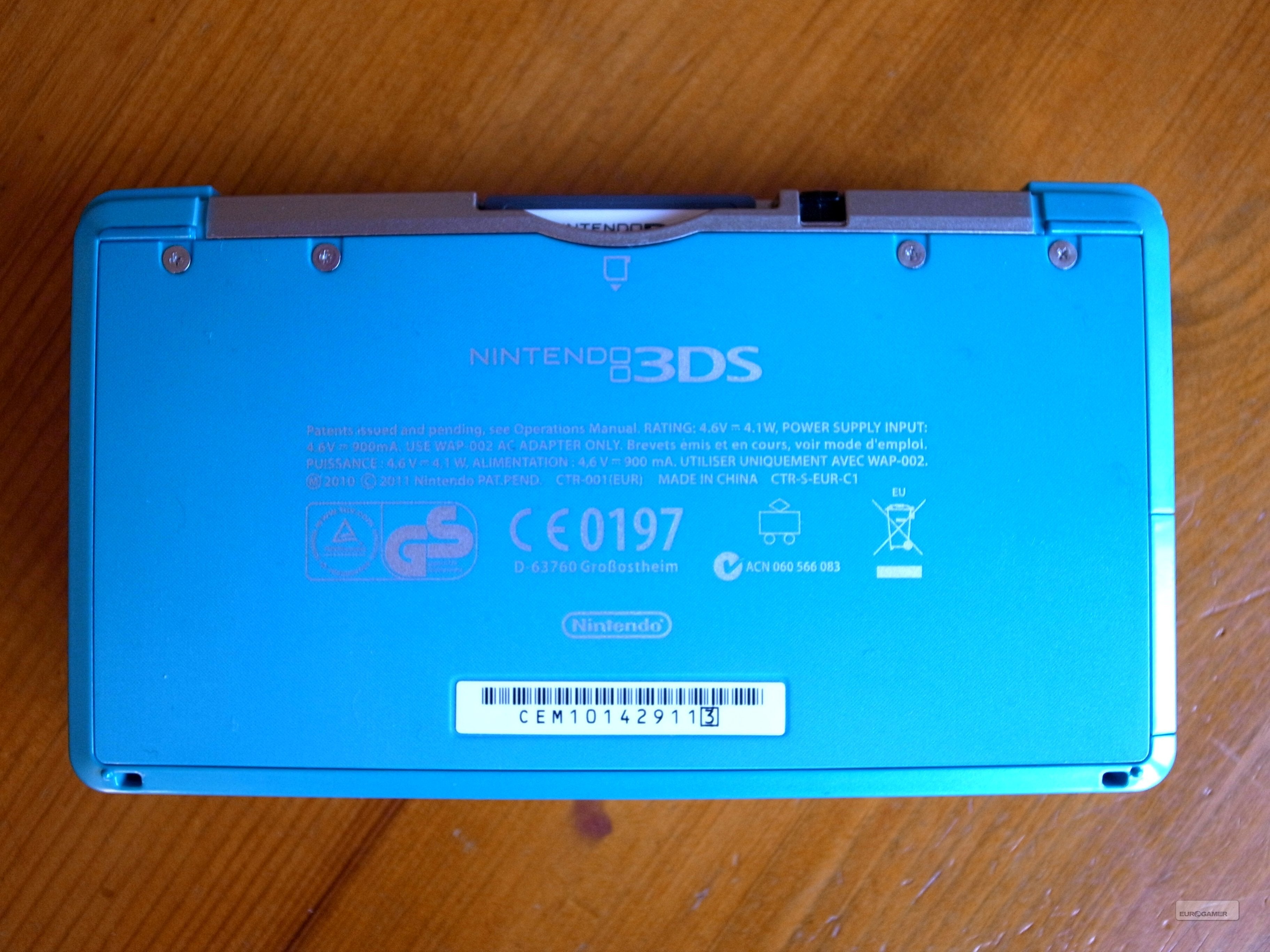 Draai je de 3DS om, dan zie je aan de onderkant heel wat tekst staan, samen met een barcode en je persoonlijke serienummer. Niet heel interessant, dus laten we het apparaat eens van de zijkant bekijken. Vooraan is er een ingang voor een hoofdtelefoon te vinden, en deze zou zowat alle apparaten uitgerust met een pinnetje moeten ondersteunen. Verder is er een lampje te zien dat aangeeft dat je 3DS ingeschakeld is, terwijl daarnaast een lichtje laat zien wanneer je je handheld aan het opladen bent. Aan de linker zijkant is er een schuifknop aanwezig waarmee je het volume kan regelen, wat een hele vooruitgang is ten opzichte van de onhandige drukknoppen op de DSi. Daarnaast is de ingang voor SD-kaarten ook aan deze kant te vinden, netjes beschermd door een aan de 3DS verbonden dekseltje.