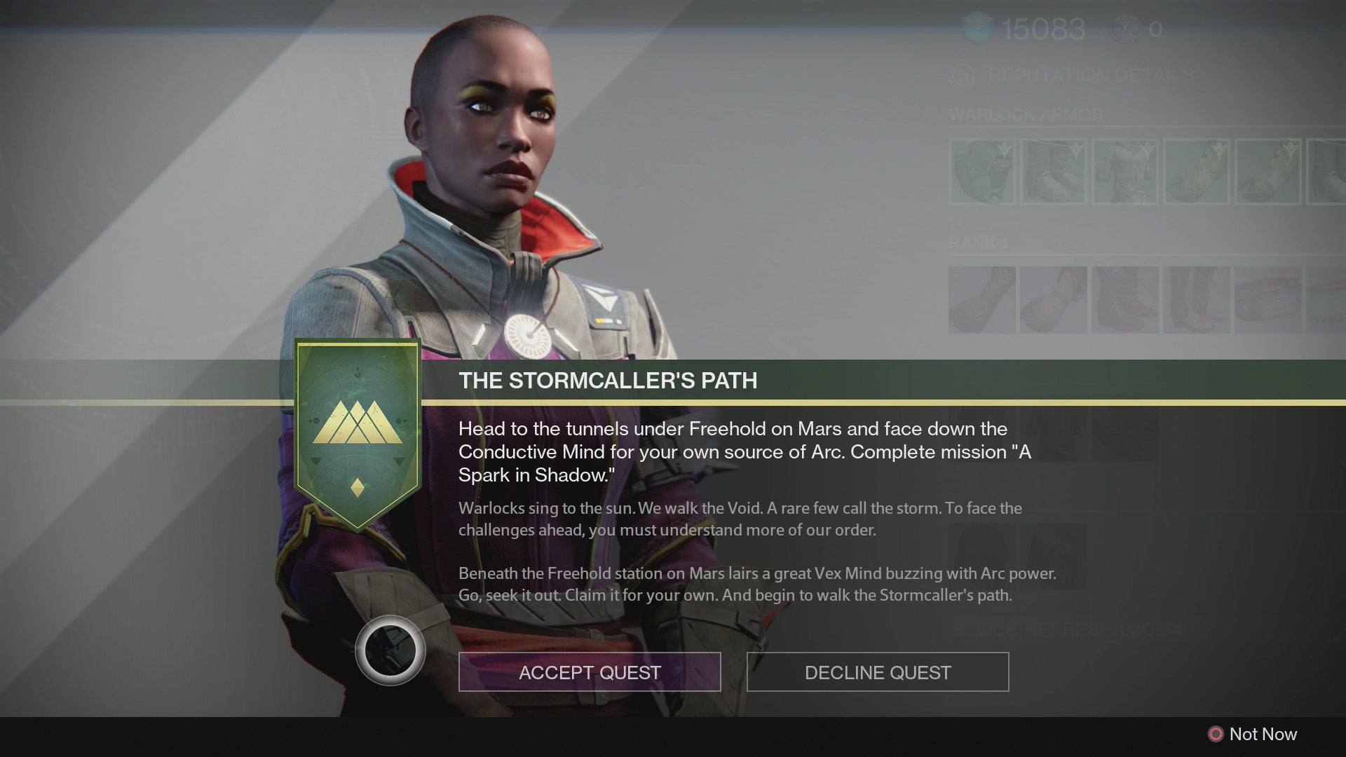 Als je hiermee klaar bent, ga je naar de Tower en praat je met Ikora Rey. Zij geeft je de The Stormcaller's Path quest. Accepteer de uitdaging en ga naar Orbit.