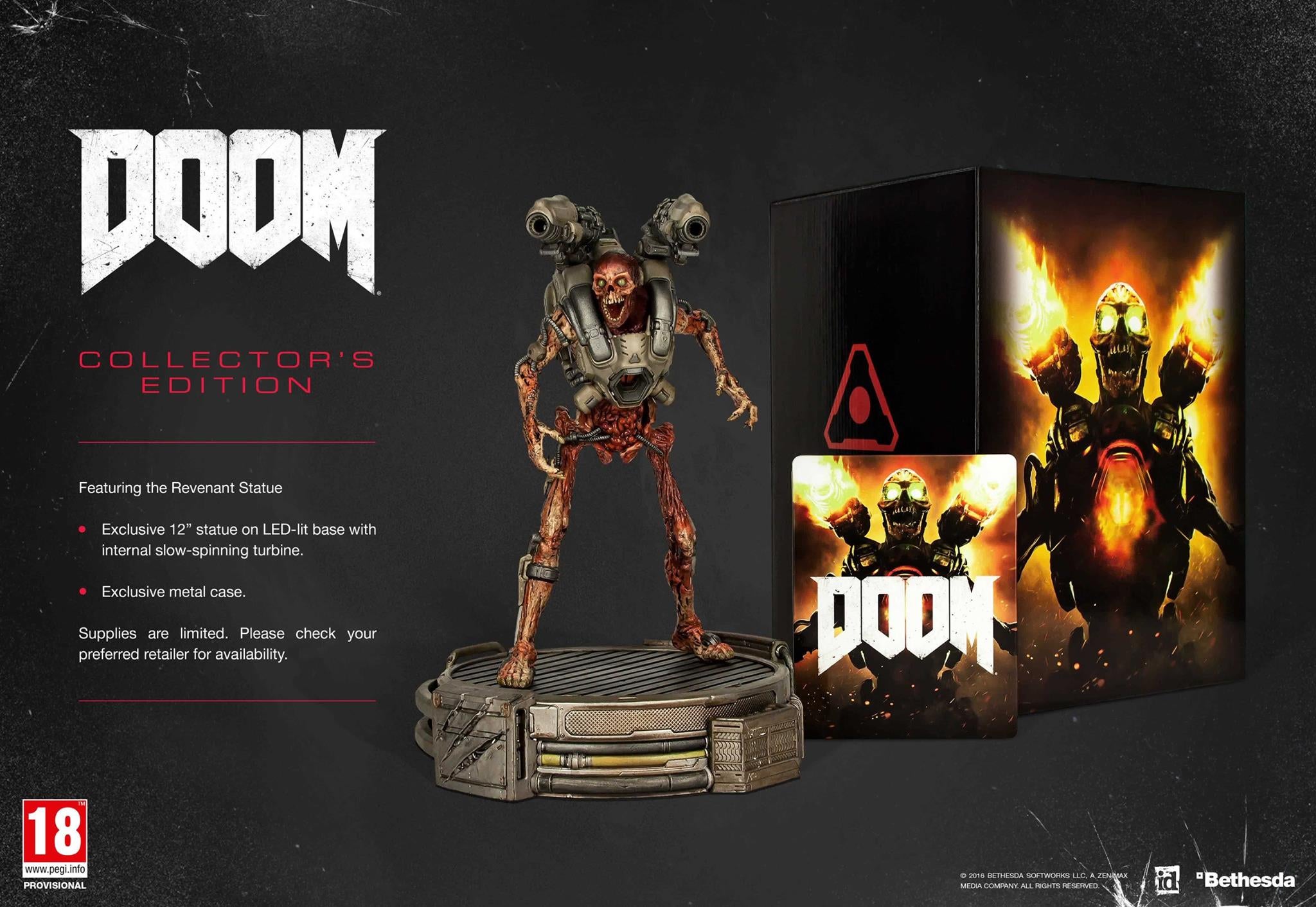 Doom komt op 13 mei voor de pc, PlayStation 4 en de Xbox One uit. Naast de reguliere uitgave is er ook een Collector's Edition. De adviesprijs van de Collector's Edition is 129,99 euro. Er is ook sprake van een pre-order-bonus. Spelers die Doom van tevoren bestellen, krijgen een Demon Multiplayer Pack. Dit pakket bevat een Demon Armor Set, drie skins, zes verschillende kleuren en id Software logo's voor de wapens.