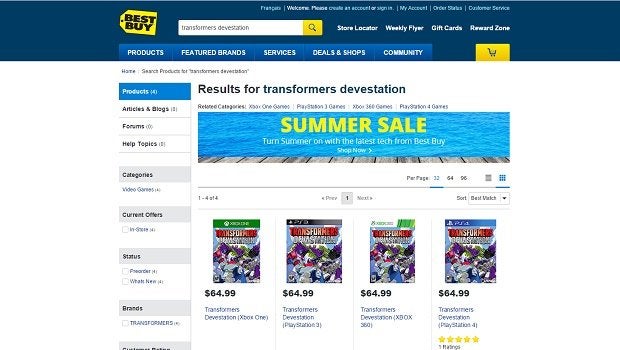Best Buy biedt Transformers Devastation aan voor de PlayStation 3, PlayStation 4, Xbox 360 en Xbox One. De game lanceert op 6 oktober 2015 en wordt uitgegeven door Activision.