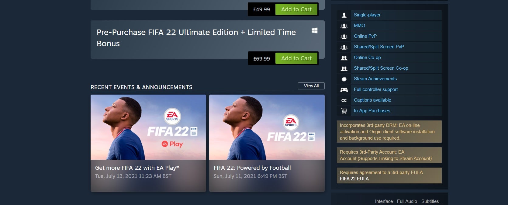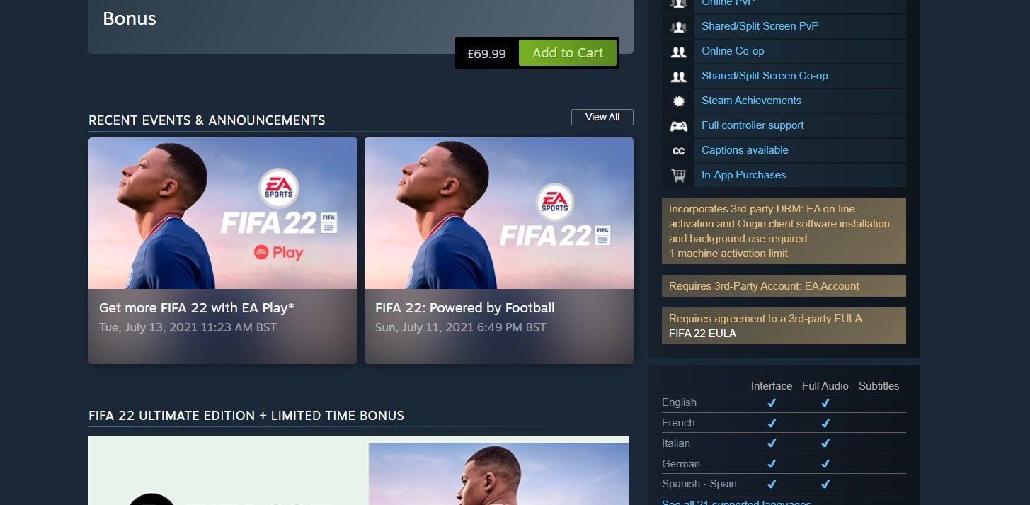 De pc-versie van FIFA 22 heeft toch geen one machine activation limit. Dat zegt uitgever Electronic Arts nadat de Steam-pagina het tegendeel beweerde.