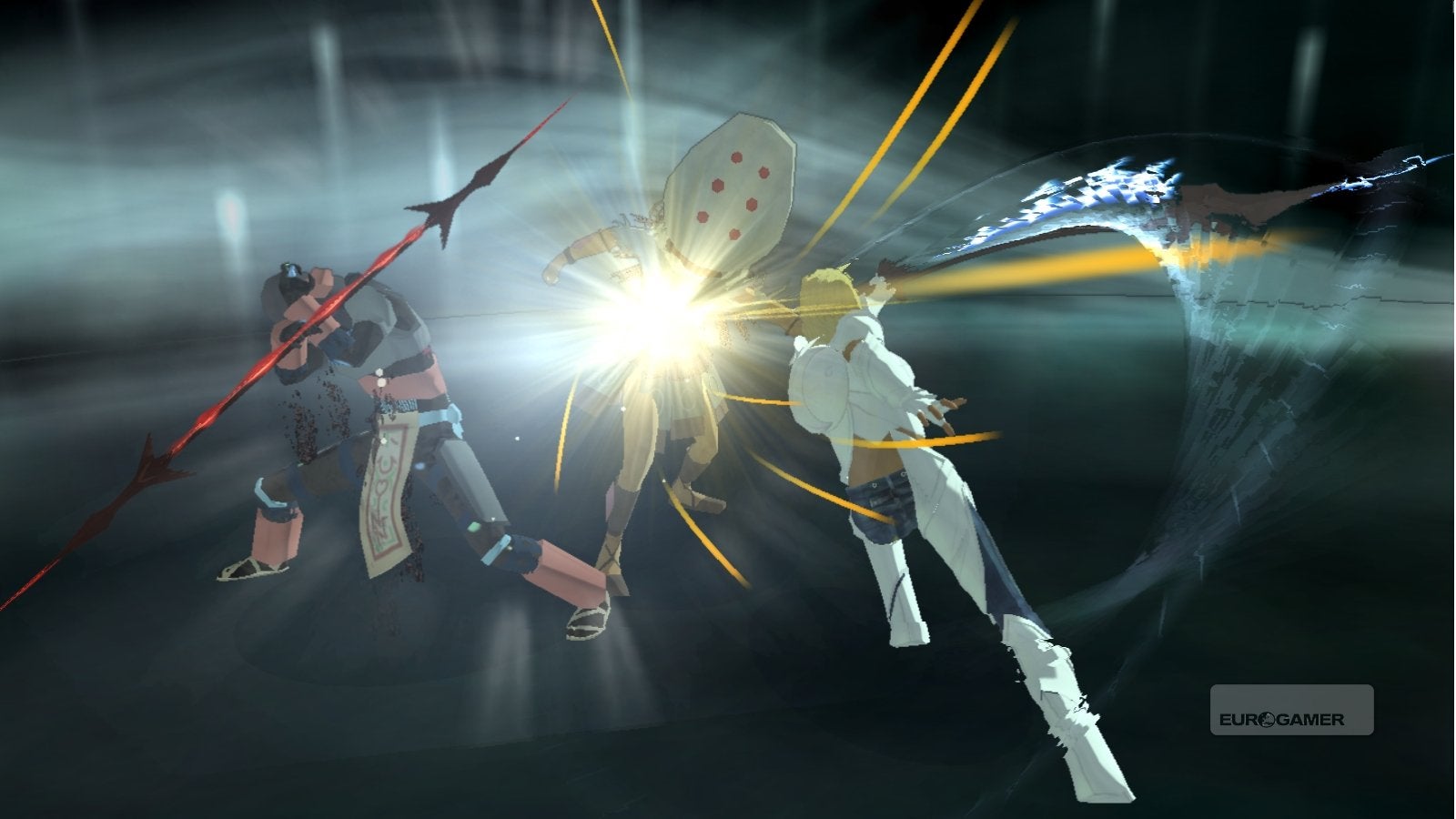 Maar nu het spel zelf. Zoals al bekend ben jij Enoch en moet je zeven gevallen engelen achterna. Je start ongewapend aan je queeste. Tijdens vijandelijke ontmoetingen kun je je tegenstander echter beroven van hun wapens. Er zijn in totaal drie wapens beschikbaar, en je kunt slechts één wapen tegelijk met je meedragen. Wat opnieuw totaal anders is dan de overvloed aan wapens bij de meeste andere games. Tijdens de demo kon ik al de Arch en de Gale uitproberen. Daarnaast is er ook nog de Veil. Volgens wat de makers mij verzekerden, is het wapengebruik wat te vergelijken met blad-steen-schaar. Elk van de drie wapens heeft zo zijn voor- en nadeel. Zo is de Arch het meest effectief tegen de Veil, de Veil dan weer tegen de Gale en de Gale werkt het best tegen de Arch.