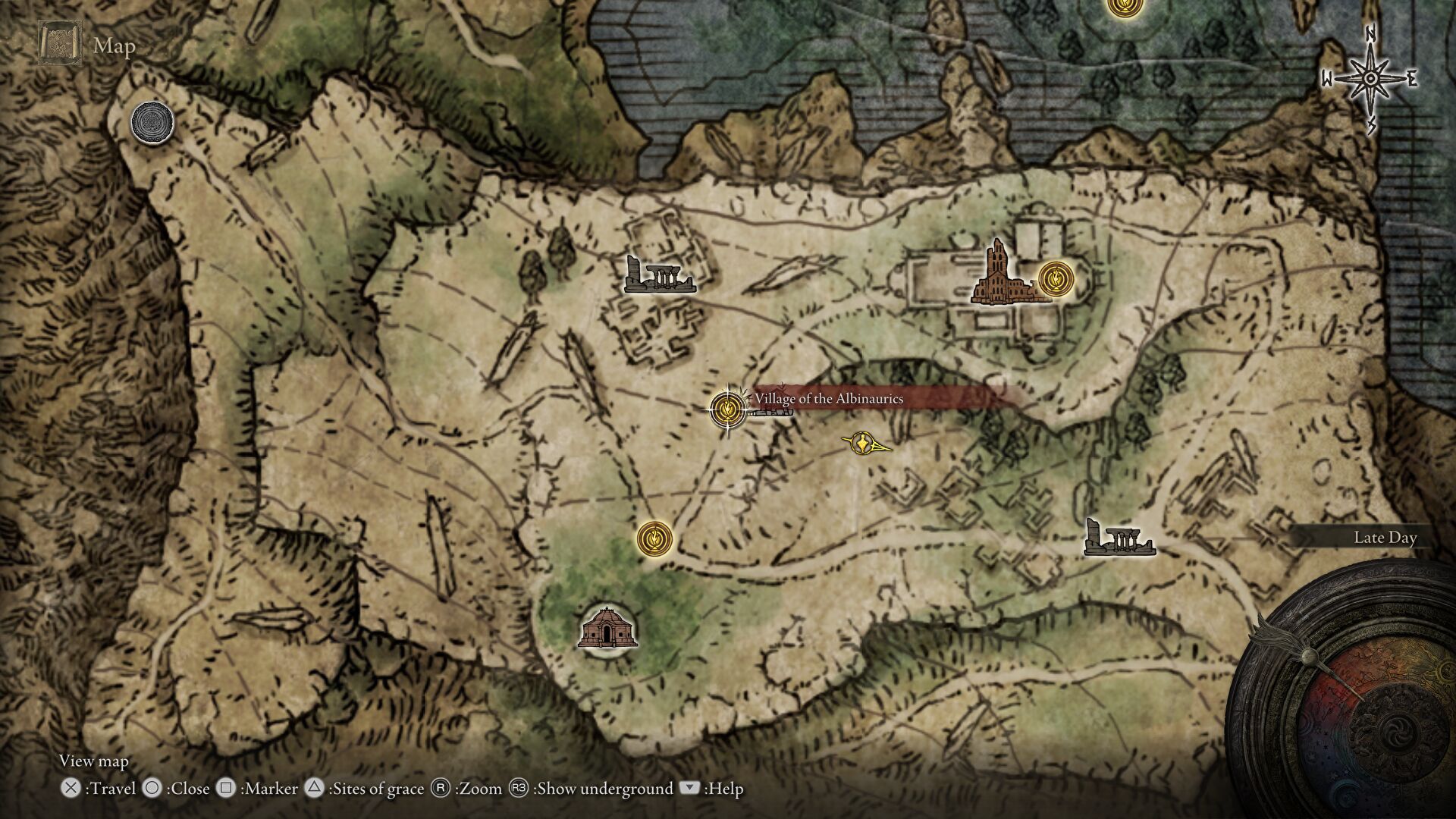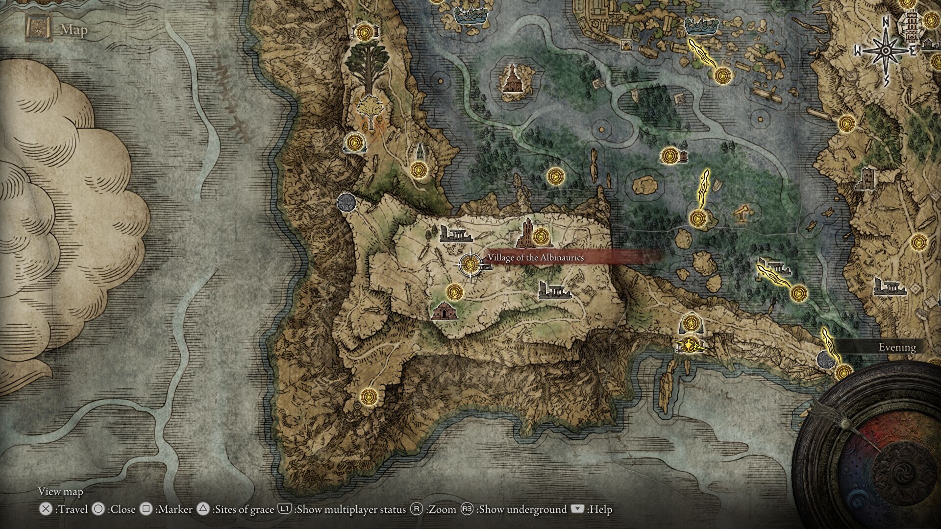 Het Village of the Albinaurics is goed verborgen. Je kan het niet zien op de map, aangezien het verborgen zit onder hoge kliffen. Daarom moet je vertrekken in het meer in het zuidoosten (waar je start in Liurnia), en vervolgens de oever volgen in noordwestelijke richting. Op een bepaald moment zal je een donkere grot ziet en hoog boven je een brug.
