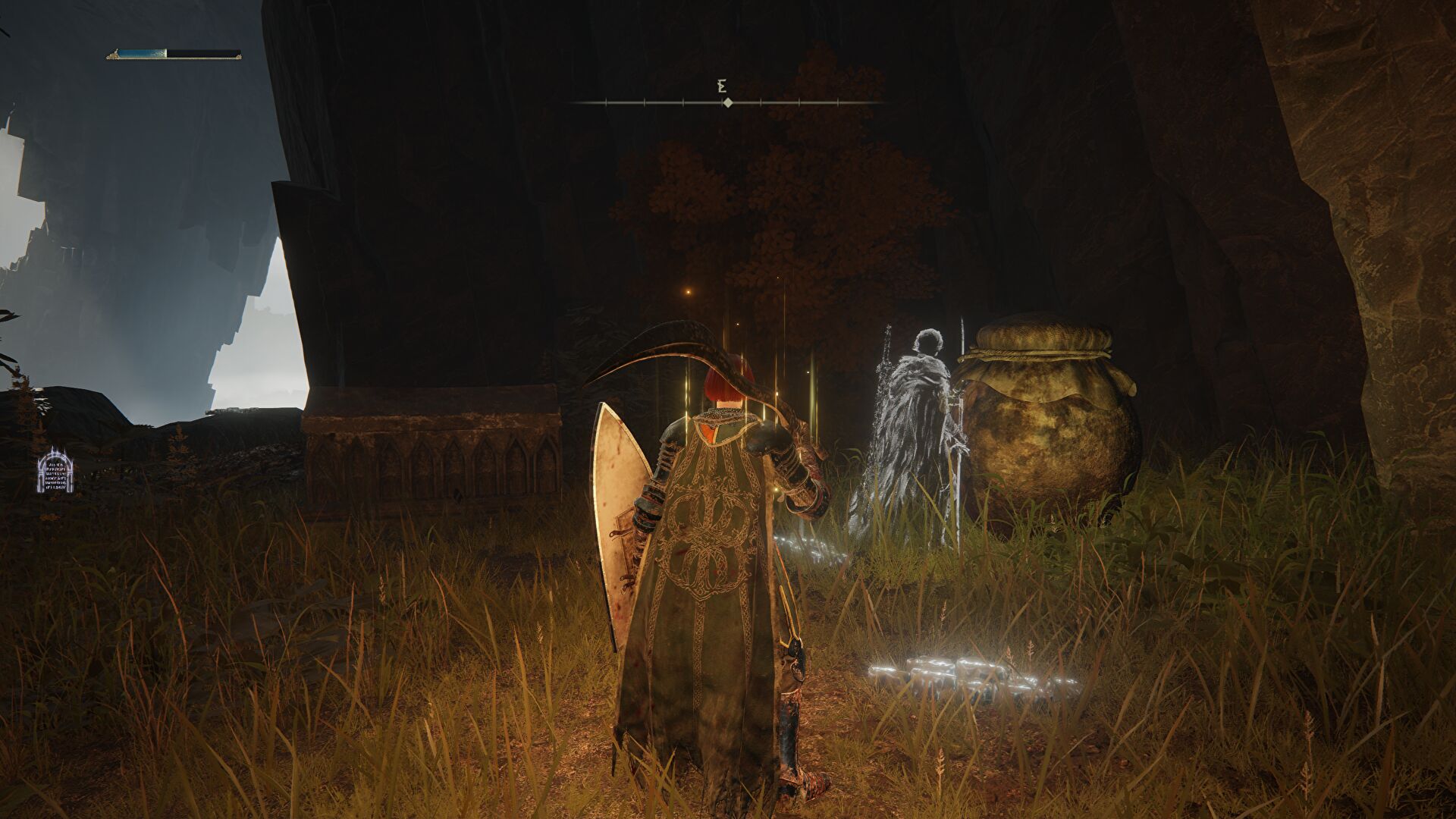 Sla tegen de pot en er komt een personage tevoorschijnt genaamd Albus. Praat met hem en hij zal je de rechterzijde van het Haligtree Secret Medallion geven. Ook vertelt hij dat je het moet tonen aan iemand genaamd Latenna. Praat vervolgens nog eens met hem en hij zal sterven.