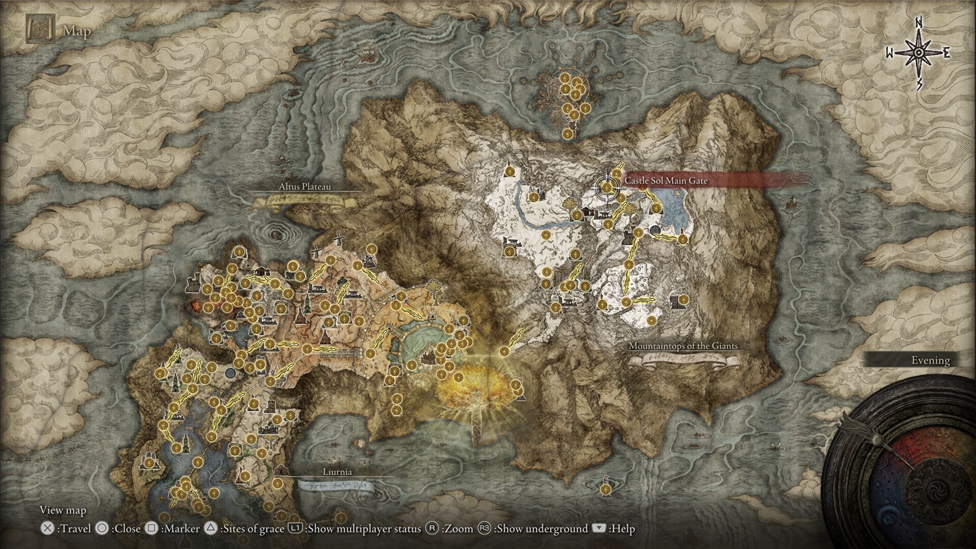 Als je met Latenna of Millicent gesproken hebt, dan weet je dat de linkerhelft van het Haligtree Secret Medallion in Castle Sol ligt. Castle Sol ligt in het noorden van de Mountaintop of the Giants.