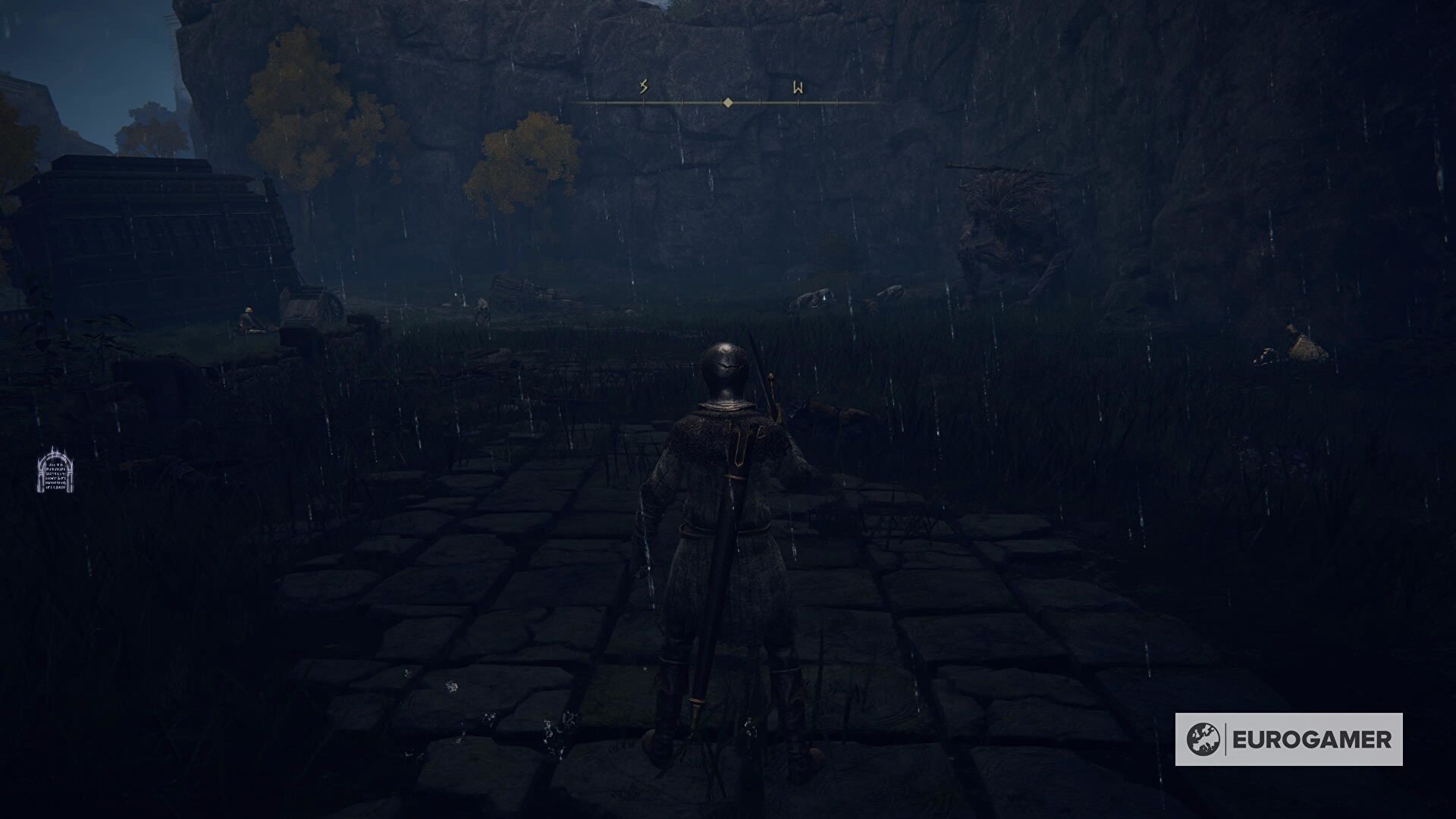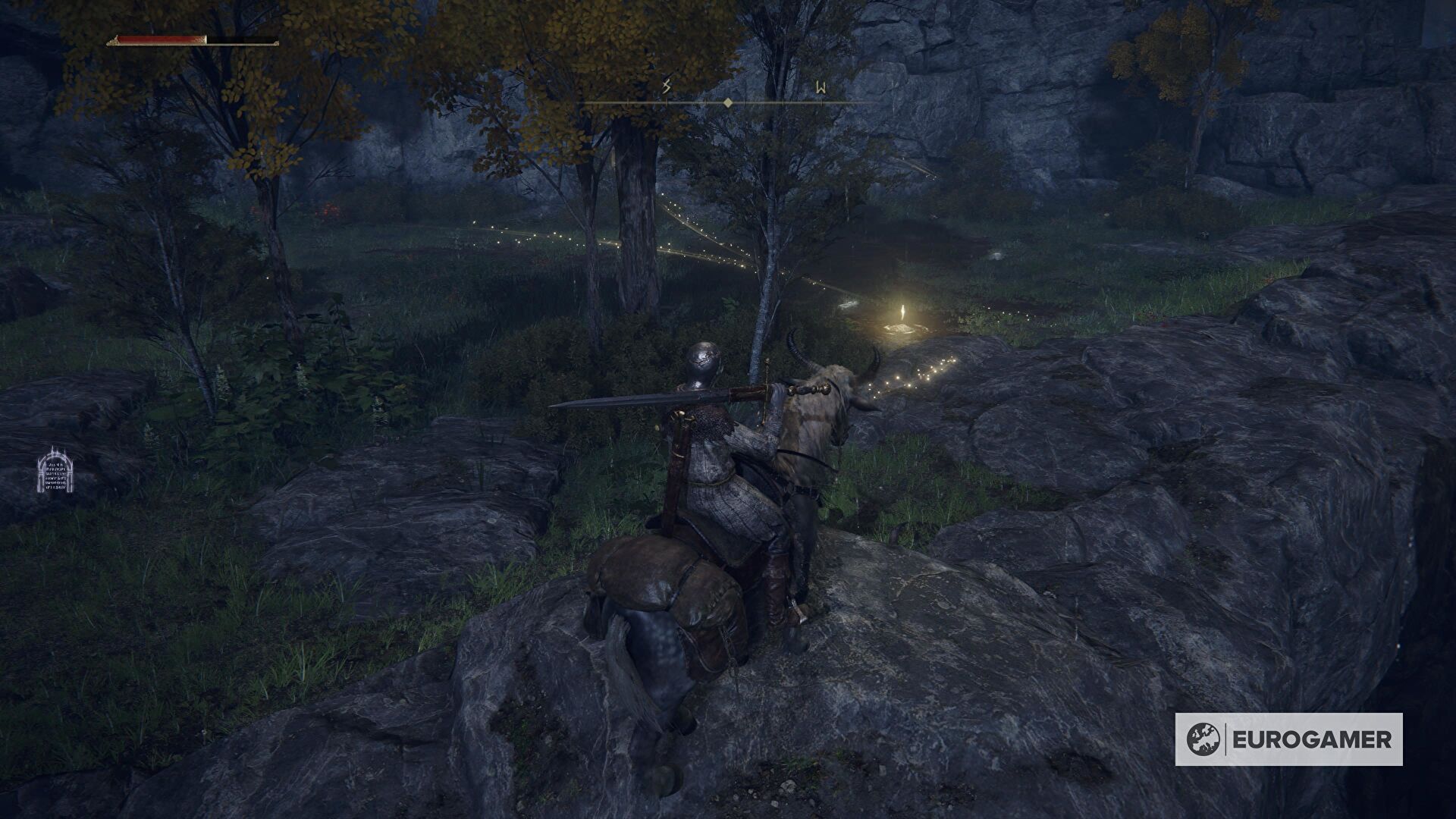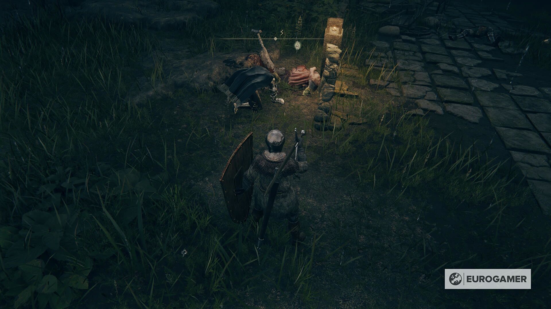 Nu is het moment aangebroken waarop je de Grafted Blade Greatsword in Elden Ring moet zoeken. Keer terug naar de driesprong waar je eerder was en neem het overgebleven pad in het midden. Op een bepaald moment kan je je laten vallen naar een Site of Grace.