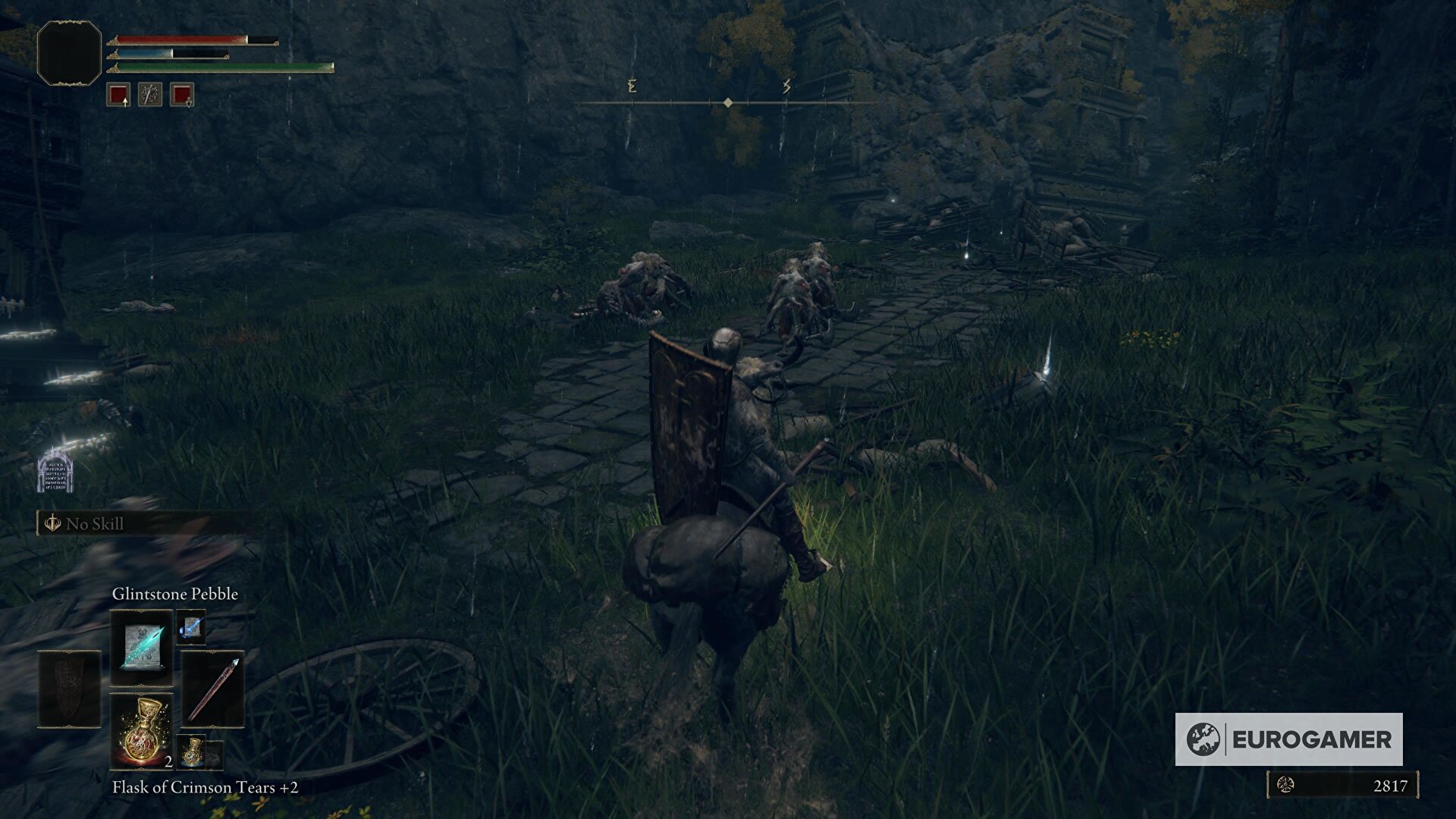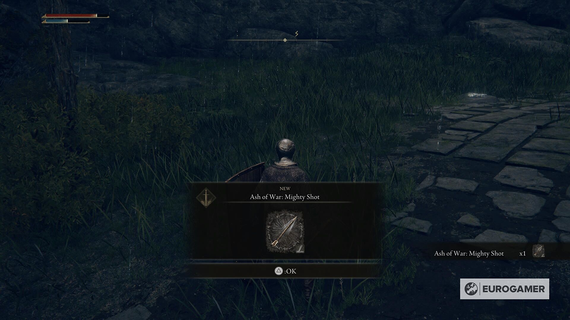 Blijf de hoofweg volgen tot je een Teardrop Scarab tegenkomt. Dood deze en krijg de Ash of War Mighty Shot.