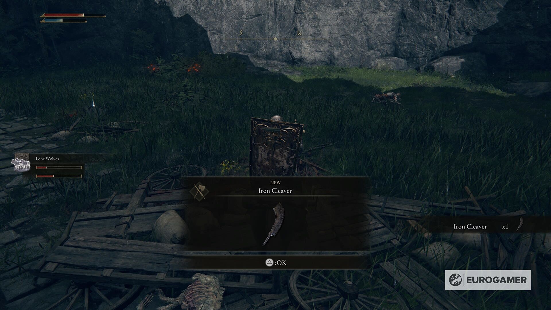 Achteraf kan je hier nog een Iron Cleaver vinden bij de kapotte kar en zijn er ook nog twee Smithing Stones [1] te vinden.