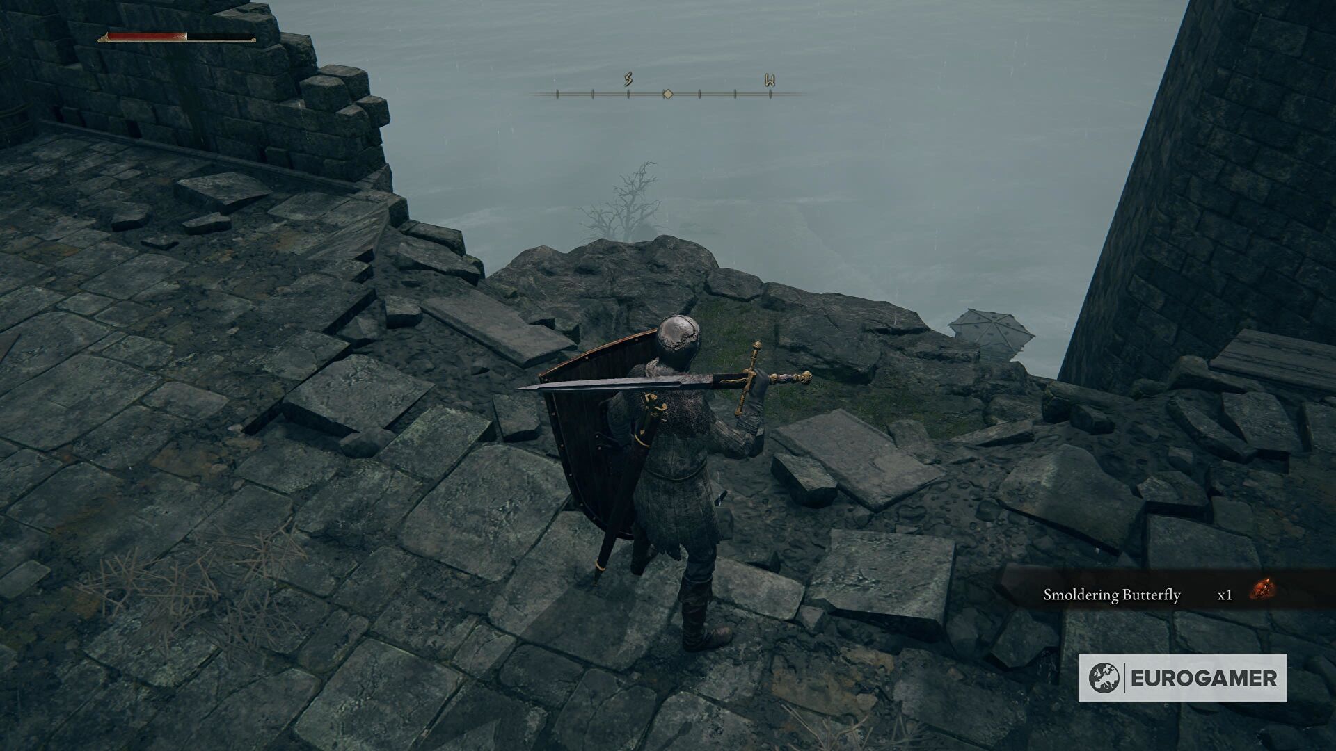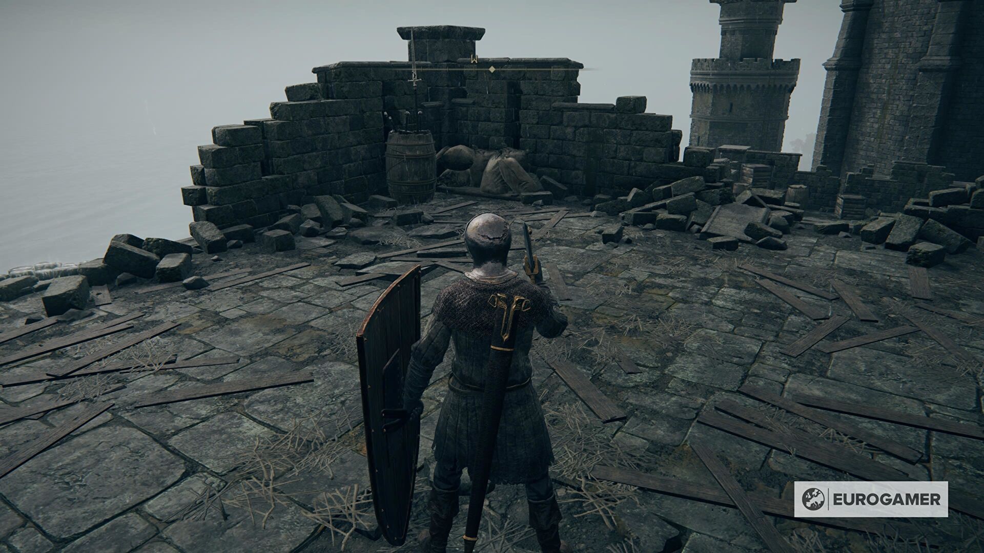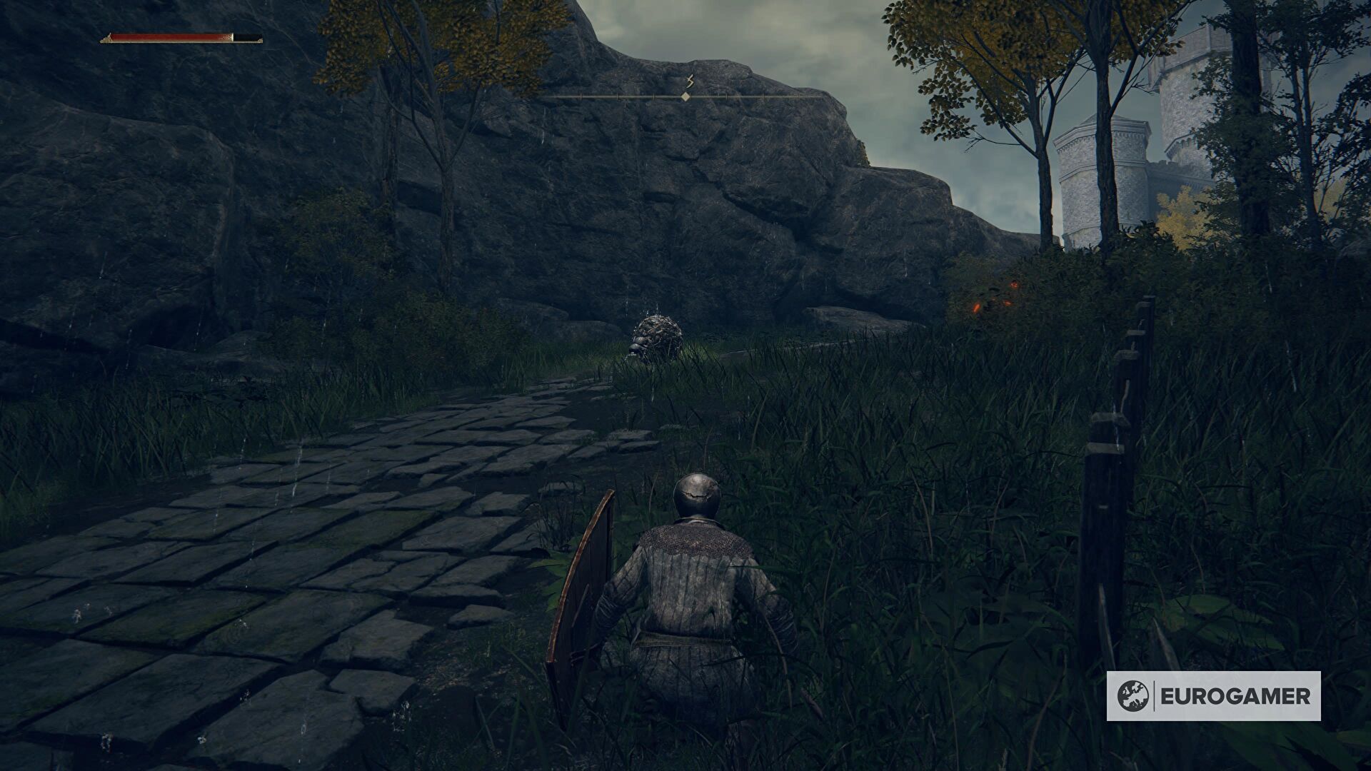 Aan de rechterkant kan je hier het map fragment vinden van Weeping Peninsula. Raap dit snel op. Castle Morne wordt namelijk bewaakt door een Giant Golem Archer, een reusachtige golem die maar al te raak schiet met zijn pijlen.