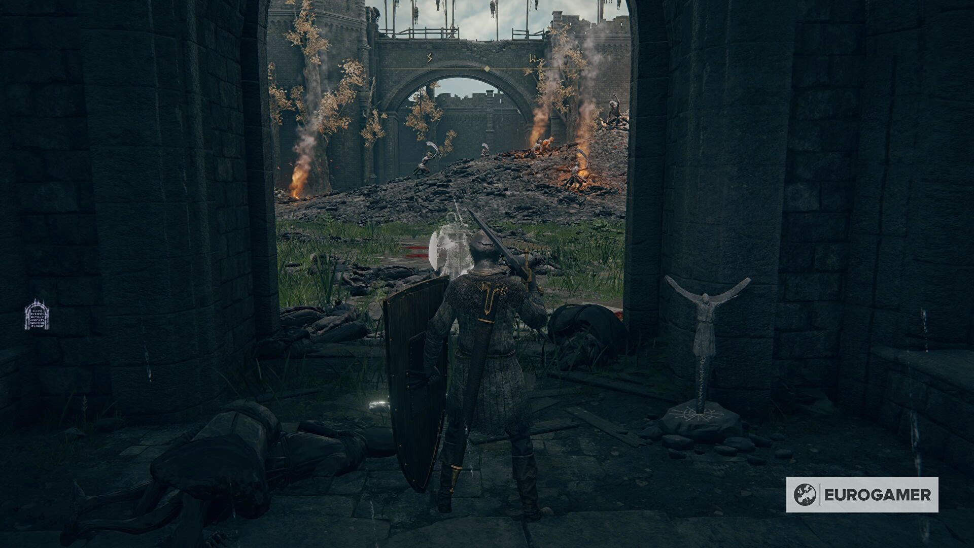 Als je het kasteel betreedt, ontdek je een Site of Grace in een kamer vol met gesneuvelde soldaten.