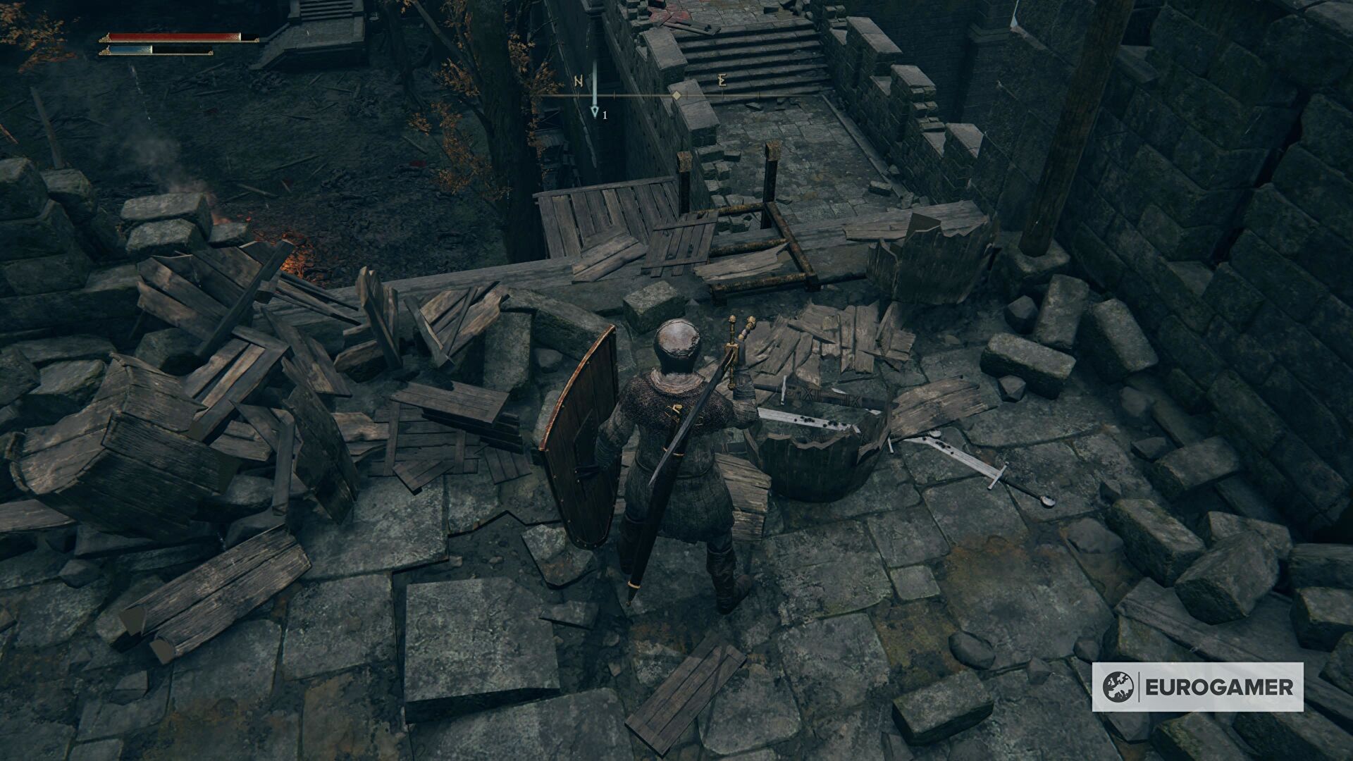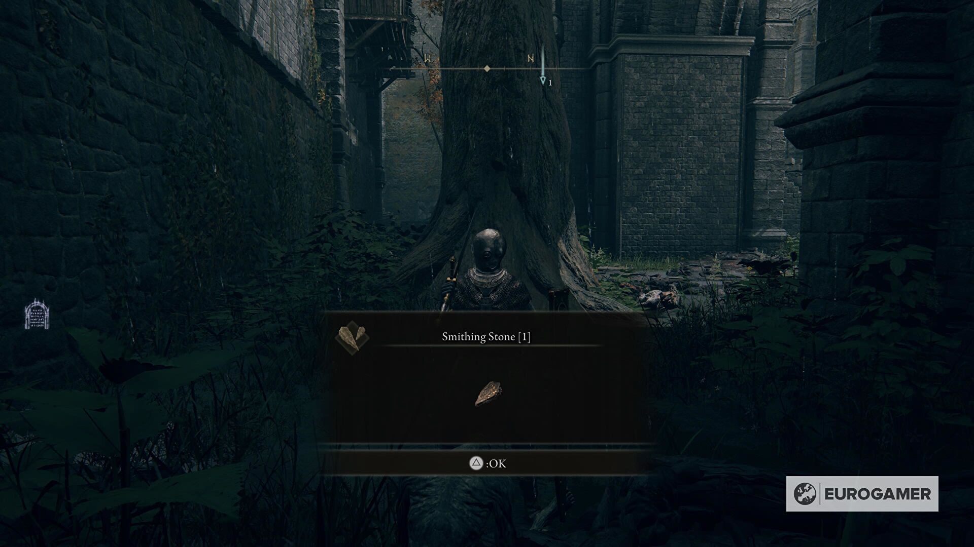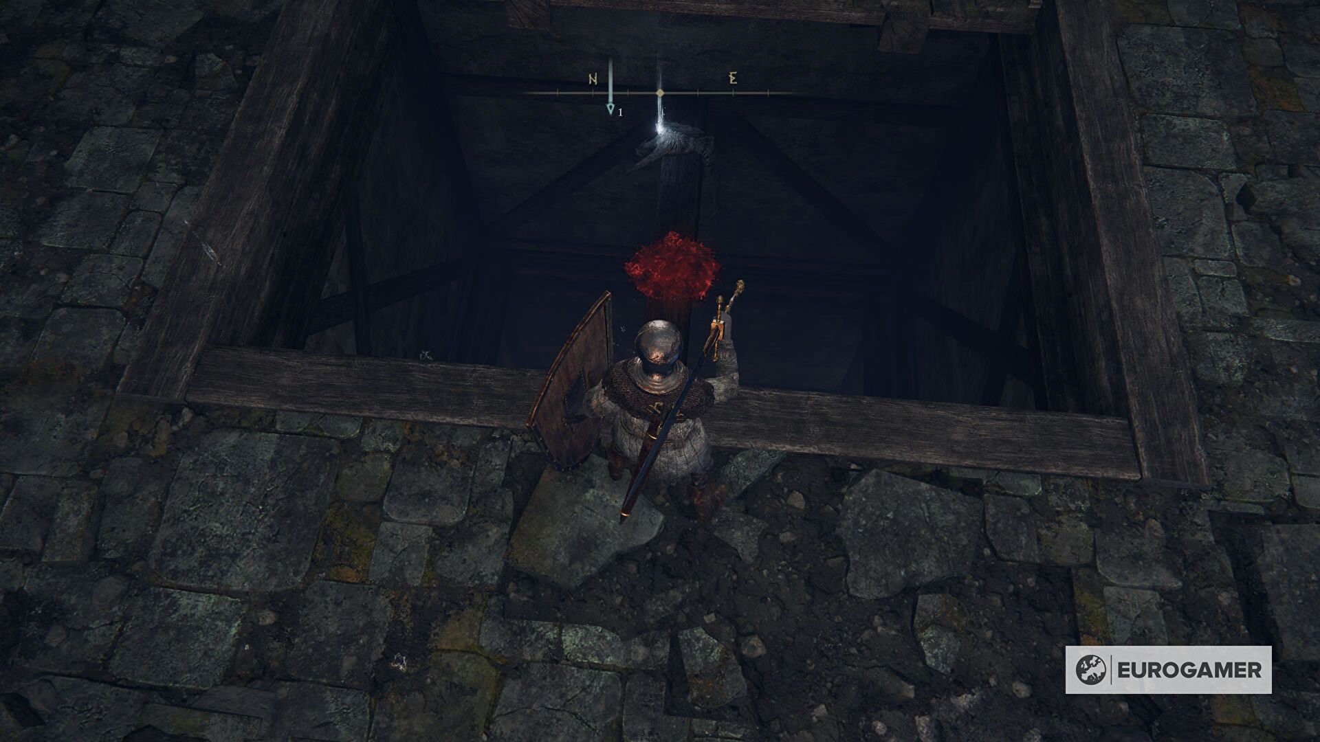 Als je besluit om naar binnen te sluipen, zal je wel enkele belangrijke items mislopen. Wandel eerst naar links tot je op een platform komt. Daar hangt een enkele hond rond. Dood hem en krijg een Smithing Stone [2] in de plaats.