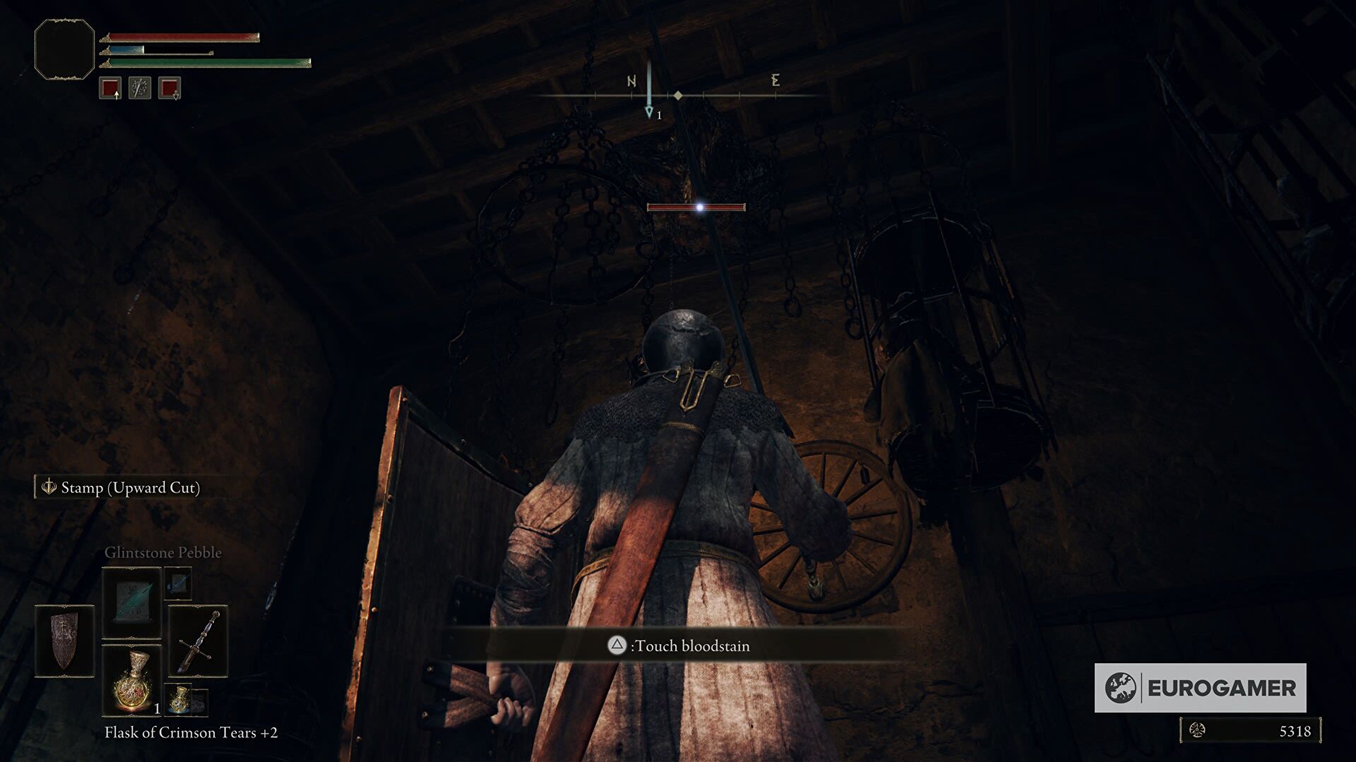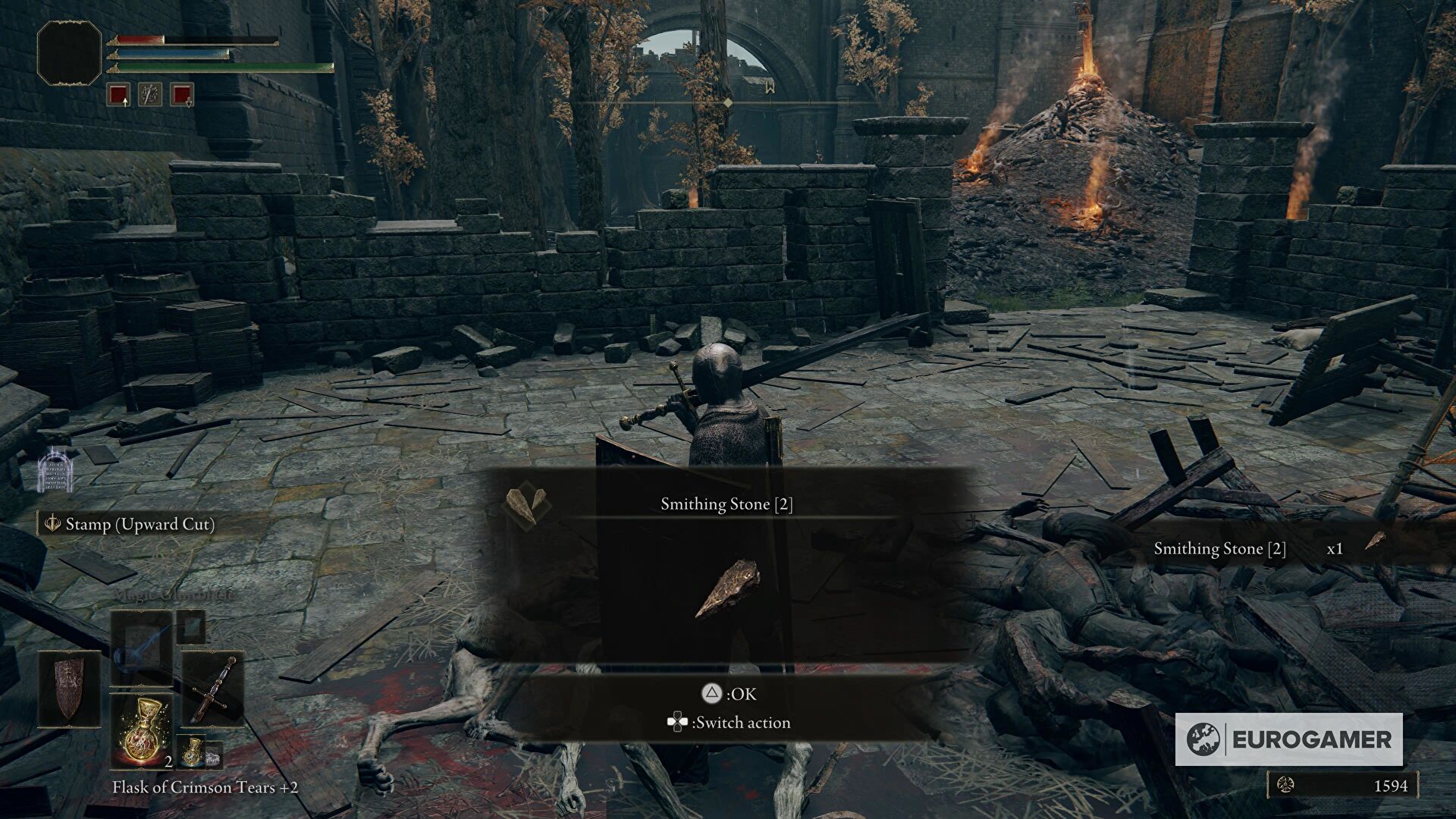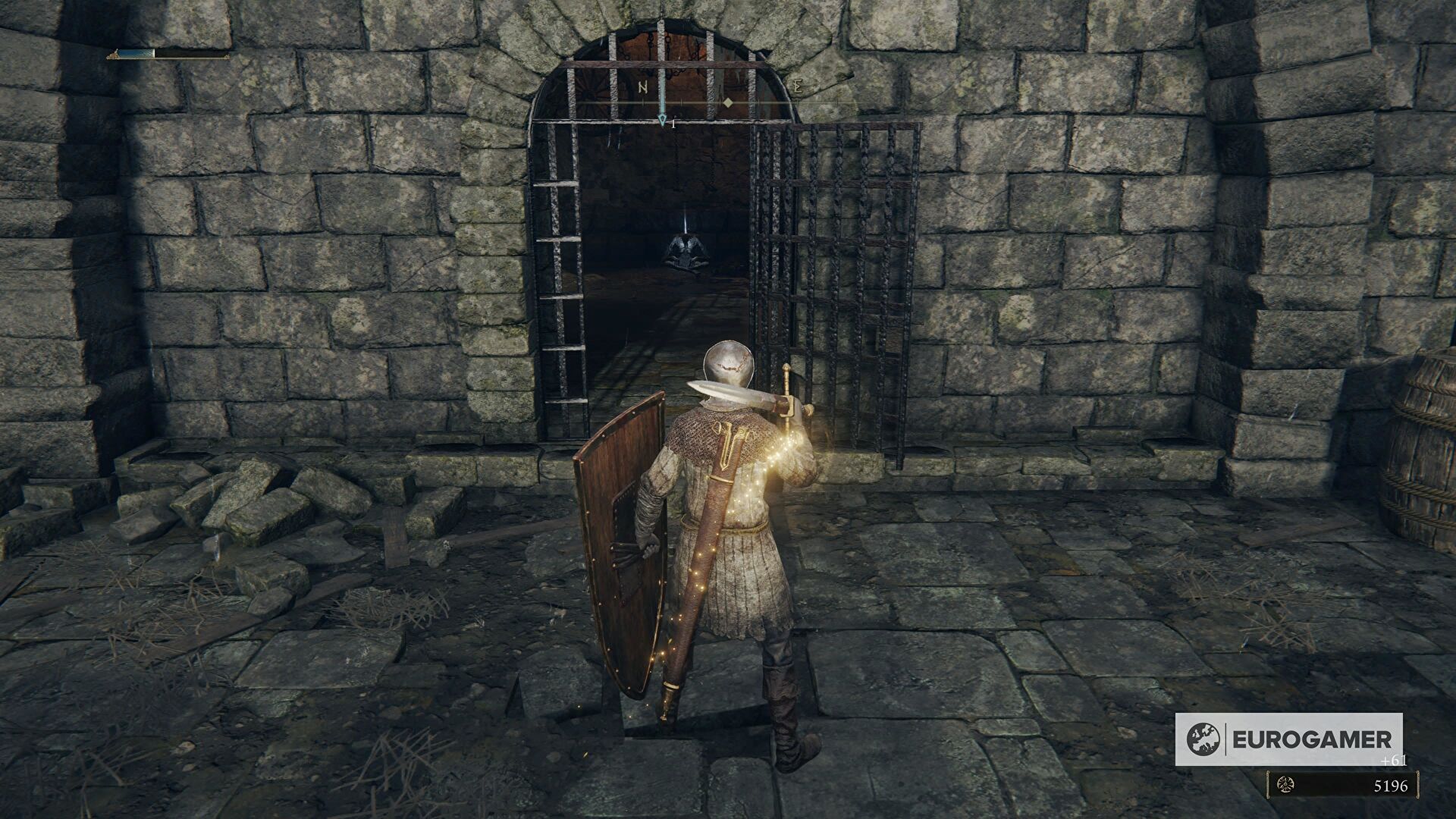 Als je besluit om naar binnen te sluipen, zal je wel enkele belangrijke items mislopen. Wandel eerst naar links tot je op een platform komt. Daar hangt een enkele hond rond. Dood hem en krijg een Smithing Stone [2] in de plaats.