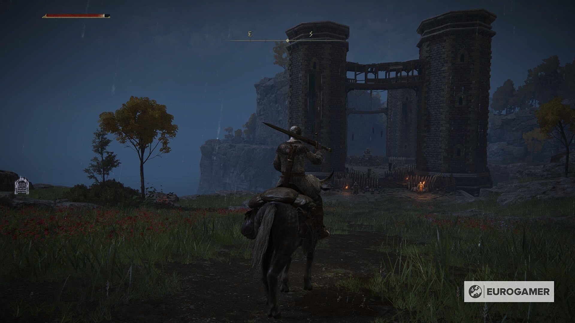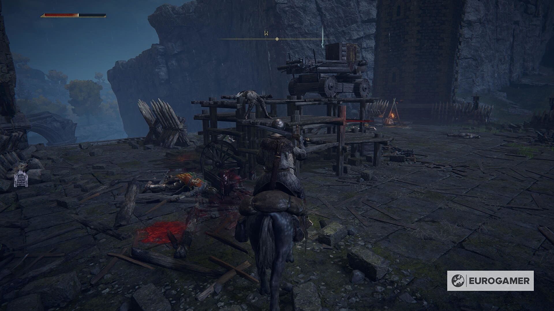 Het pad naar de Bridge of Sacrifice is duidelijk; rijd met Torrent in zuidelijke richting van de vorige Site of Grace en je ziet al snel de brug verschijnen. De brug is sterk verdedigd en op het einde van de brug staat er een soldaat met een ballista. Deze zal je beginnen beschieten zodra hij je ziet.