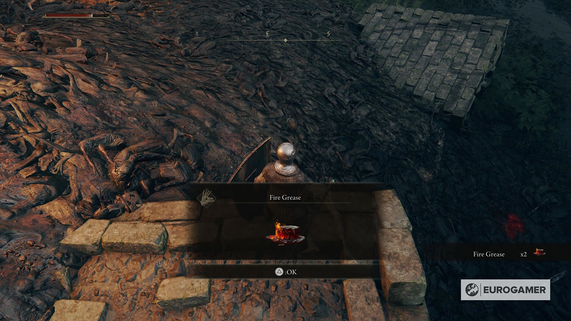 Nu is het tijd om items te verzamelen. Aan de linkerkant waar de Mad Pumpkin Head lag te slapen, vind je drie Smithing Stones [1]. Net naast de vuurkorf en de berg met lijken, kan je meerdere Smoldering Butterflies en twee Fire Grease nemen.