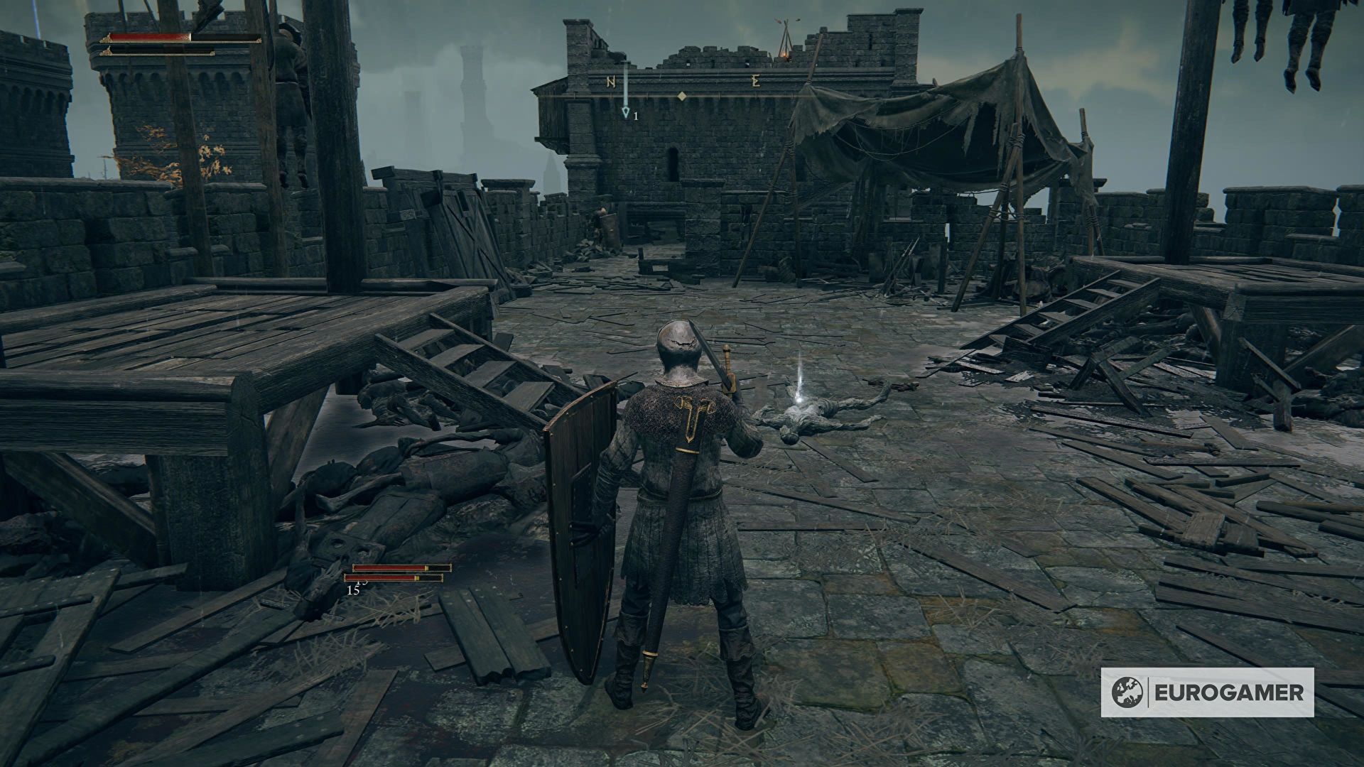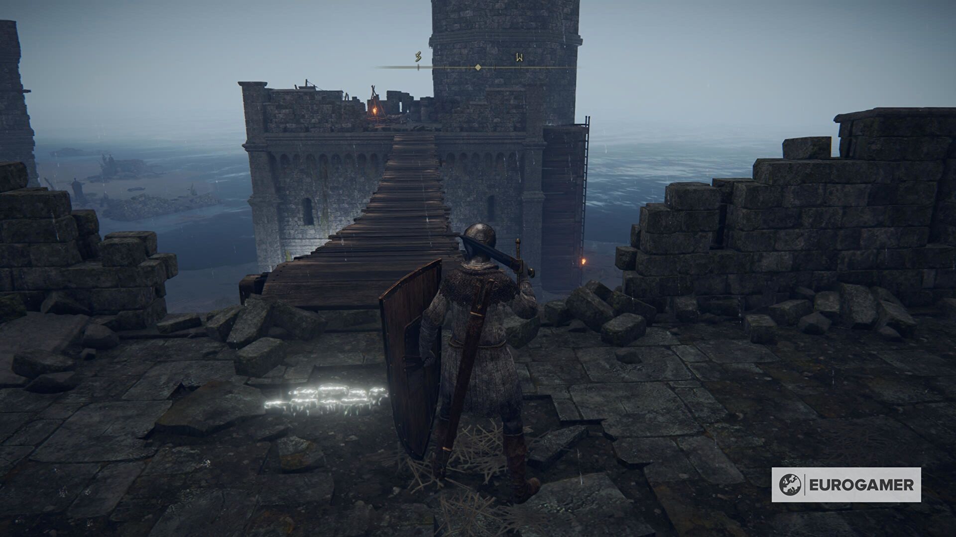 Ga nu naar buiten en ga twee keer naar links. Hier ontdek je de laatste Site of Grace die je in Castle Morne vindt.