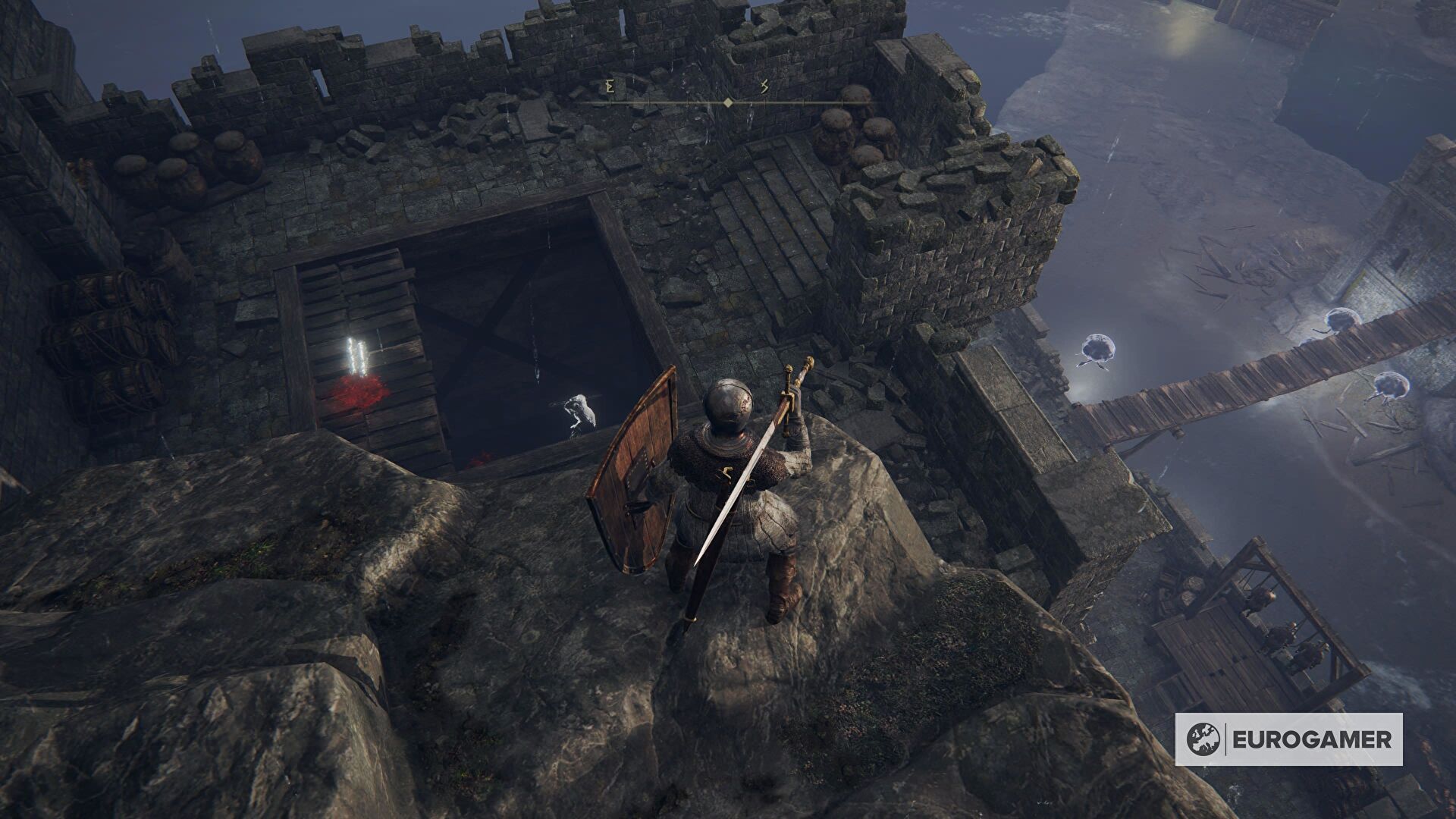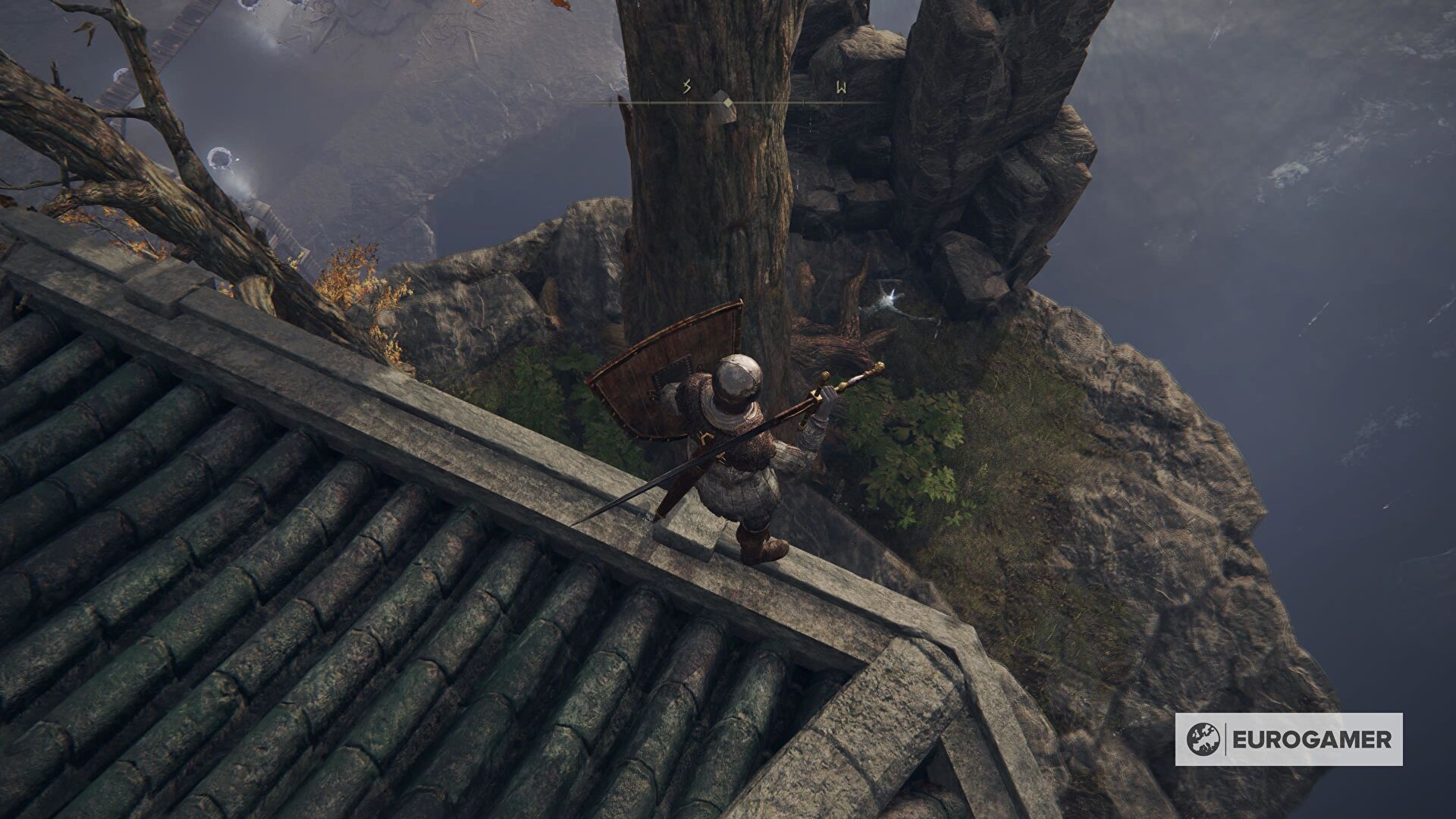 Keer terug naar de brug, en laat je vallen waar je kan op de toren. Vervolgens laat je je van de toren opnieuw naar beneden vallen.