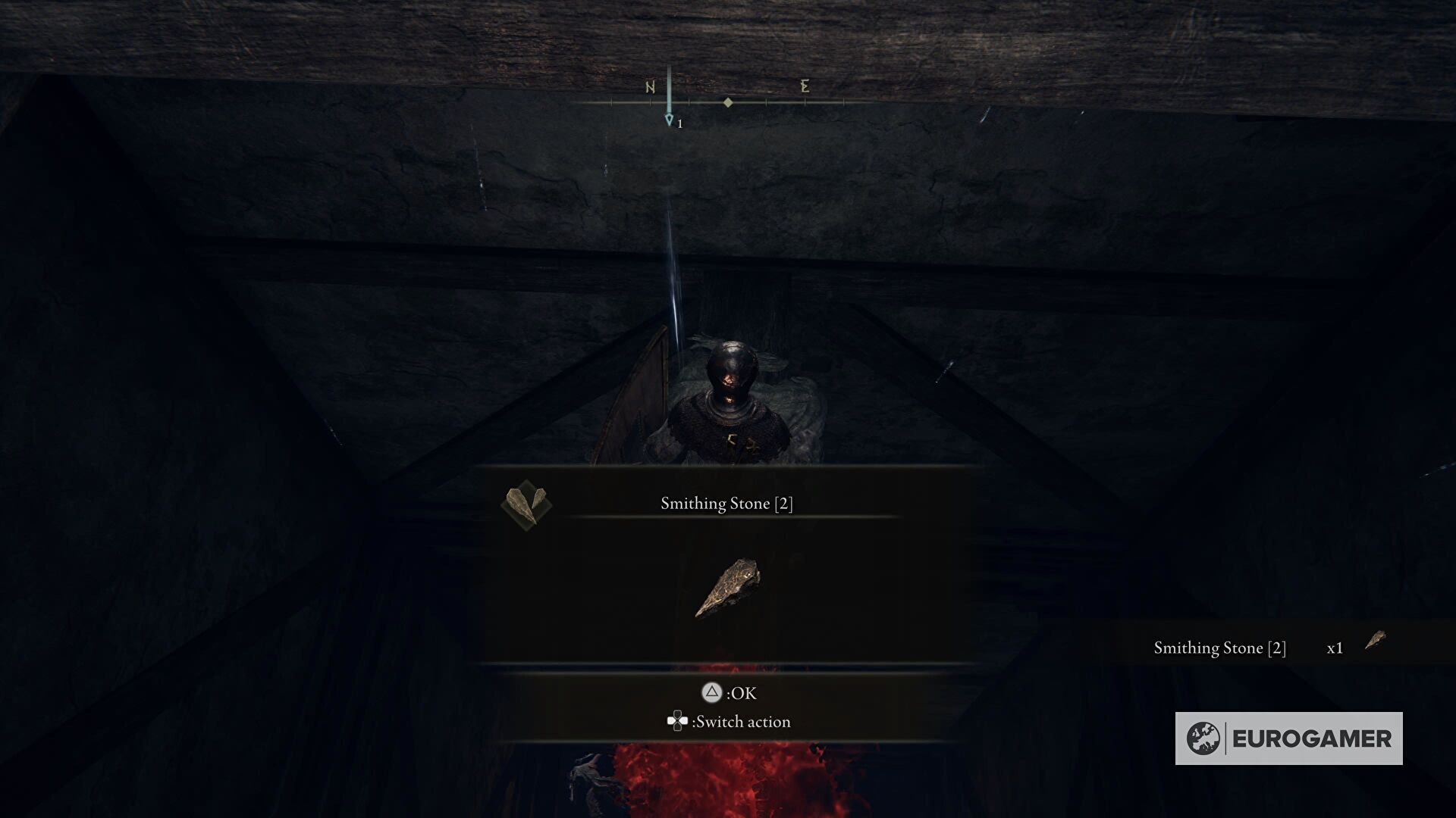 Hier moet jij je door het open dak naar beneden laten vallen. Laat je vallen op de balken die er zijn. De eerste bevat een lijk met een Smithing Stone [2].