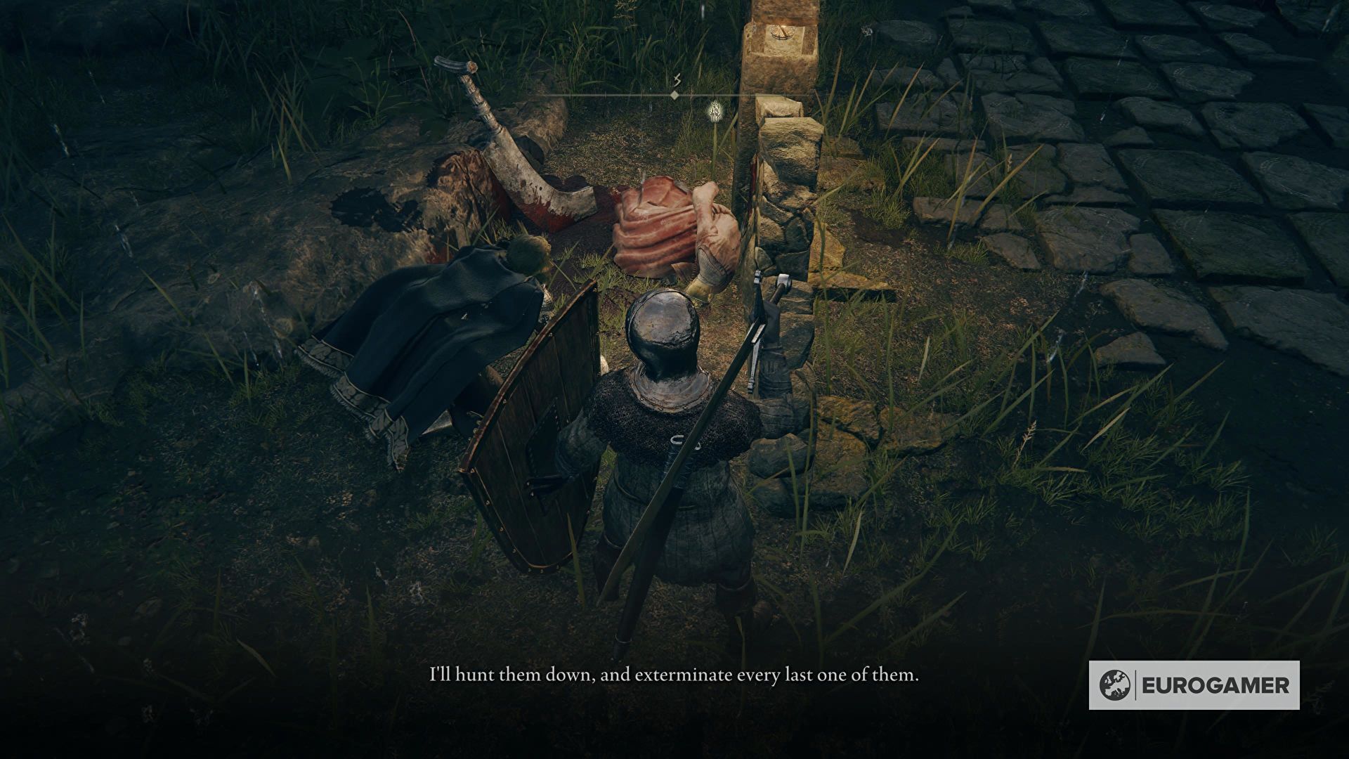 Nadat je de loot hebt verzameld, ga dan met de trap naar beneden. Daar zie je hoe twee Misbegottens een ridder vermoorden die zich heeft overgegeven. Gebruik dit in je voordeel en begin hen met een ranged weapon aan te vallen.