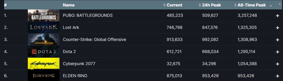 De titel van meest gespeelde game op Steam staat namelijk al vier jaar op naam van PUBG: Battlegrounds. Andere titels die het momenteel beter doen dan Elden Ring zijn Cyberpunk 2077, Dota 2, Counter-Strike: Global Offensive en Lost Ark. Die games piekten respectievelijk tussen de 1 miljoen en 1,3 miljoen gelijktijdige spelers.