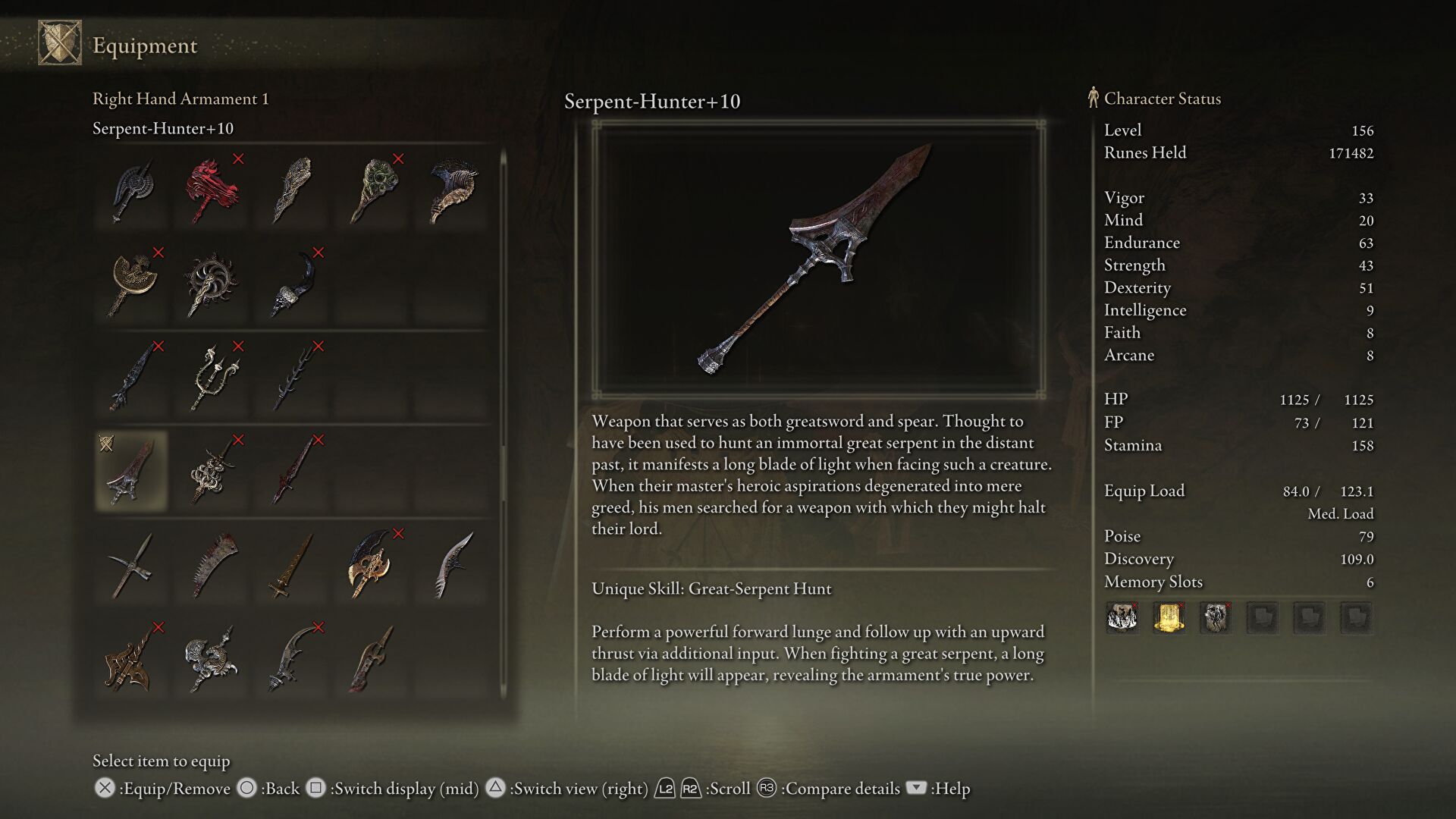 Aangezien de Serpent-Hunter zo’n belangrijk wapen is voor deze baas, zijn er geen stat vereisten om deze te gebruiken. Je kunt het wel, zoals elk ander wapen, upgraden met Smithing Stones om dit gevecht gemakkelijker te maken. Het is dus zeker een optie om het wapen op te rapen, weg te warpen, te upgraden en terug te keren naar de Site of Grace vlak voor Rykard.