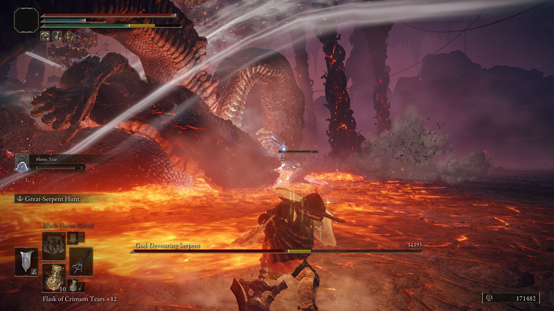 De beste strategie is dus om aan de rand van de lava te staan en aanvallen te spammen met de Serpent-Hunter. Als je ook nog eens een Mimic Tear oproept die eveneens de Serpent-Hunter heeft, dan zal God-Devouring Serpent vrij snel sterven.