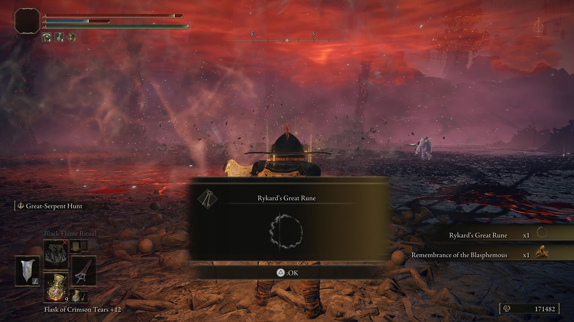 Voor een relatief makkelijk gevecht krijg je wel een zeer mooie beloning: 100.000 Runes. Je krijgt ook de Remembrance of the Blasphemous, die je kunt gebruiken voor Runes of inwisselen bij Enia in Roundtable Hold voor nieuwe items.