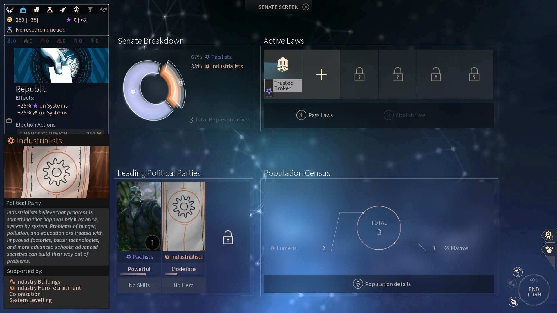 Neem de Lumeris-factie bijvoorbeeld: die ruimte-maffiosi beginnen met een senaat die uitsluitend uit pacifisten bestaat. Oorlog is immers slecht voor de zaken. Door met de pacifisten samen te werken en je Influence te gebruiken, kun je wetten laten stemmen zoals de Super Tax Act. Die verdubbelt de opbrengst van je belastingen. Om die wet te handhaven, heb je echter een sterke pacifistische factie nodig. Naargelang je acties en de bevolkingsgroepen die je rijk toetreden, winnen nieuwe politieke doctrines aan populariteit.