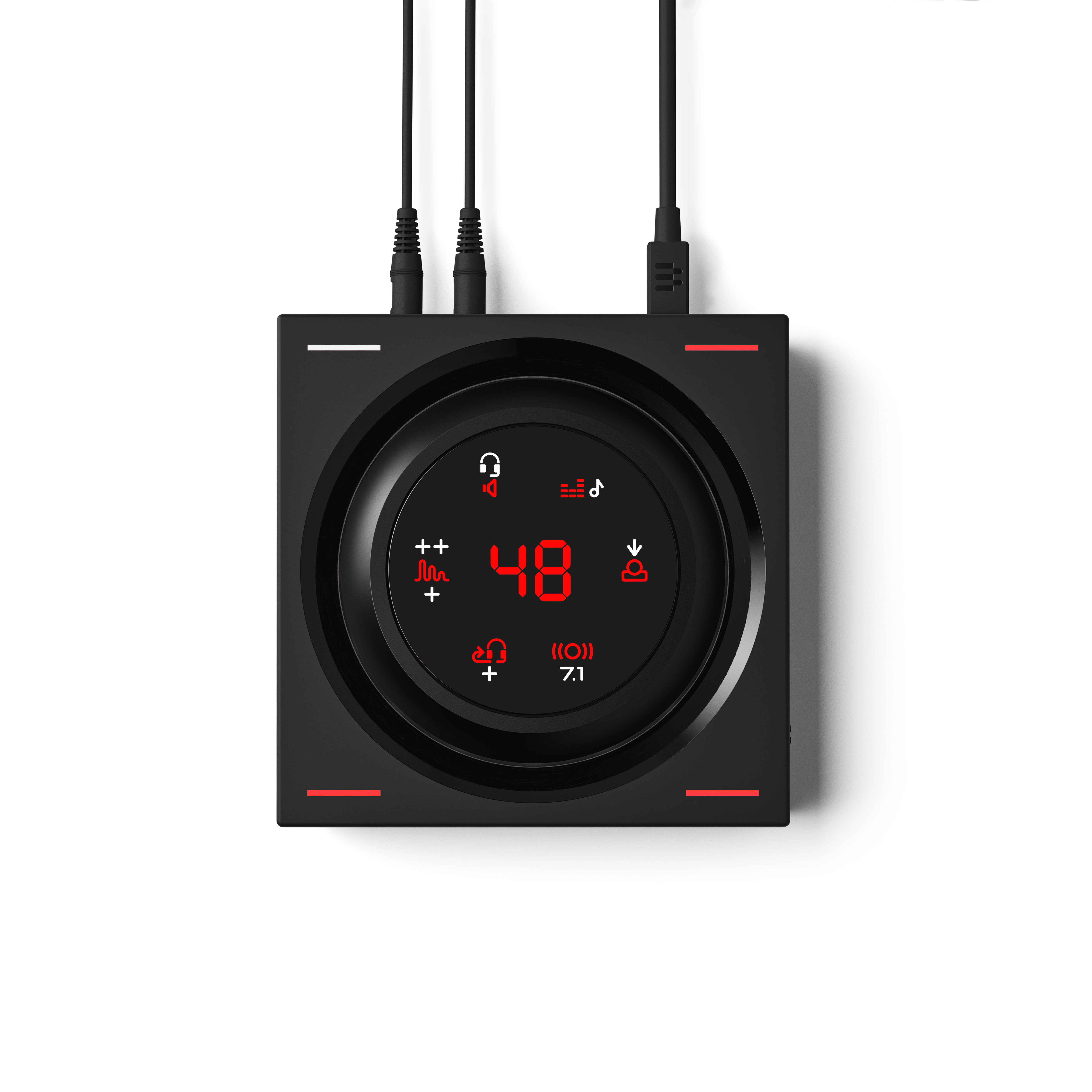 Het controlepaneel is een LED touchscreen. Hier kun je de output wisselen, tussen EQ presets kiezen, het niveau van 'sidetone' bepalen (zodat je je eigen stem kunt horen terwijl je een microfoon gebruikt), de reverb aanpassen, de richting van geluid aanpassen, en schakelen tussen 2.0 stereo en 7.1 surround sound.