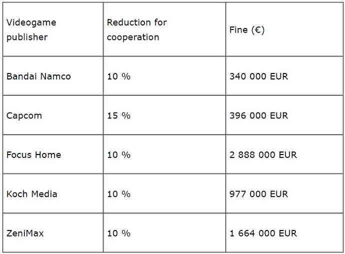 De boetes variëren tussen de 340.000 euro en 1,6 miljoen euro. Afgezien van Valve krijgen alle betrokken uitgevers wel een korting van 10% omdat ze vrijwillig hebben meegewerkt aan het onderzoek. Enkel Valve betaalt de volle pot en is de Europese Unie dus 1,6 miljoen euro verschuldigd.