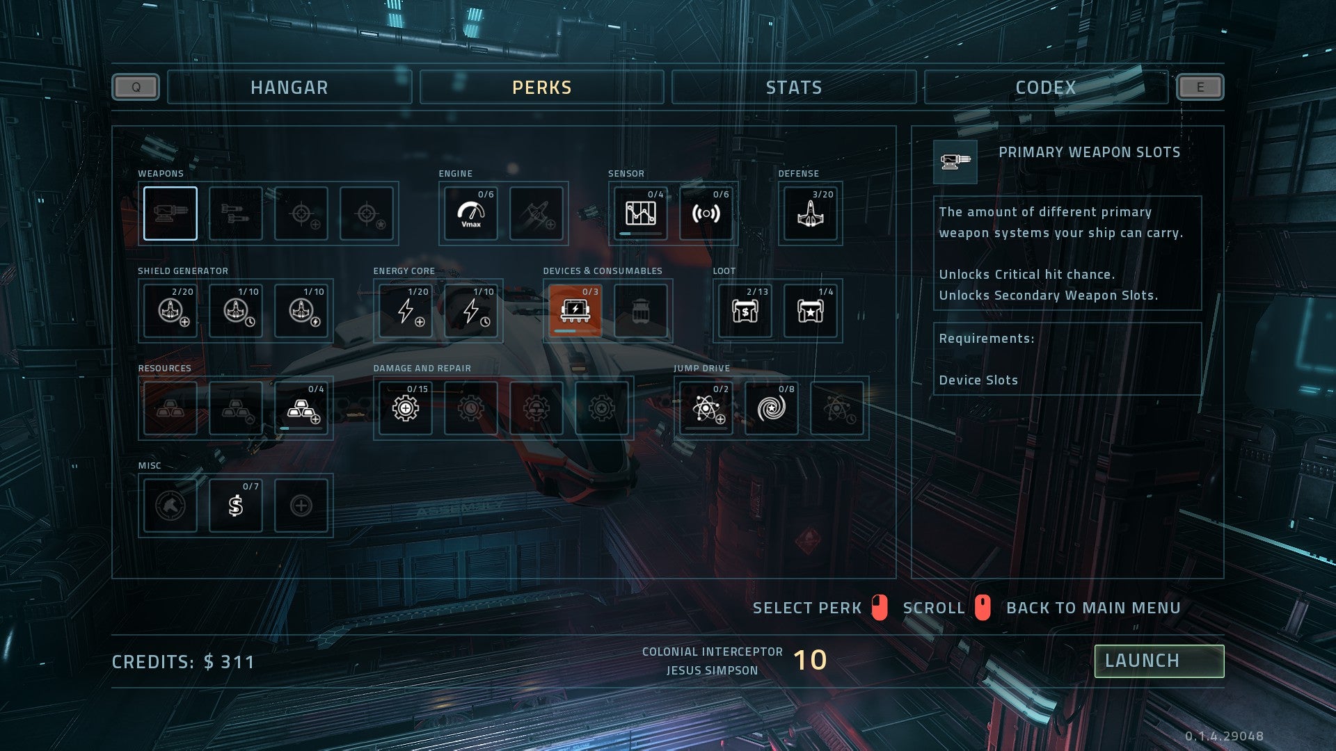 Die credits kun je voor uiteenlopende dingen gebruiken. Je ruilt ze bij handelsschepen voor ruwe materialen of brandstof in, of je zet ze in om je schip te laten herstellen. Als je het loodje hebt gelegd, kun je er ook perks mee kopen. In tegenstelling tot de tijdelijke gebruiksvoorwerpen die je tijdens een run vindt, zijn perks permanente upgrades. Denk daarbij aan een sterker schild, een grotere energievoorraad en meer opslagplaats voor primaire en secundaire wapens. Het is belangrijk dat je zoveel mogelijk van je verzamelde credits uitgeeft, want je verliest alles wat overblijft. Als je vertrouwd bent met het upgradesysteem van Rogue Galaxy, dan weet je waaraan je je in Everspace kunt verwachten.