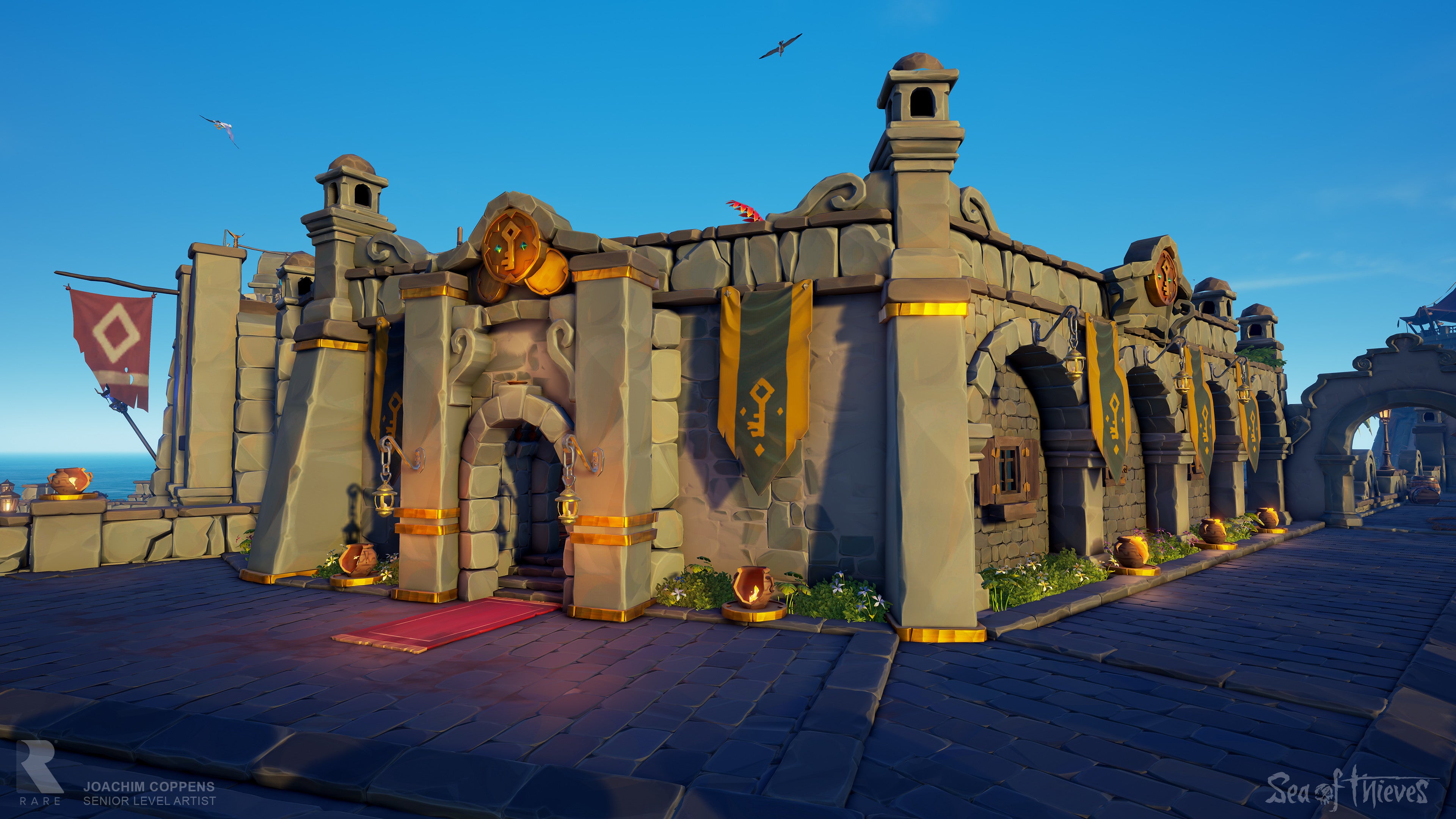 Hieraan heb ik samen met Sophie Ingledew (Senior Environment Artist bij Rare) en de rest van het team gewerkt. Sophie heeft de basis voor dit gebouw gelegd en ik heb de aankleding gedaan. Voor sommige facties was het goed nadenken wat je wil bouwen als je plots een stenen Port maakt. Voor de Gold Hoarders was het echter direct duidelijk dat het een bank moest worden omdat hun stijl draait om dure kisten en munten.