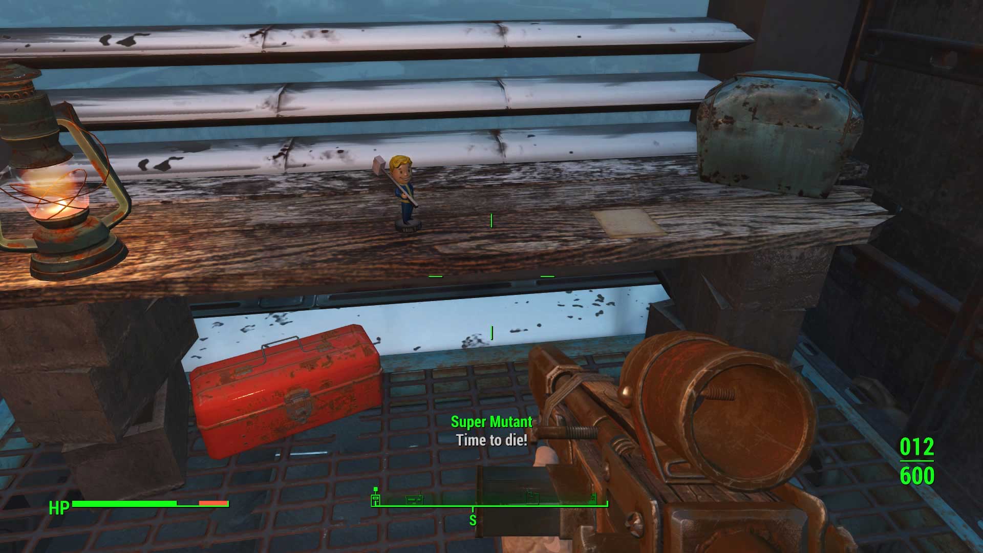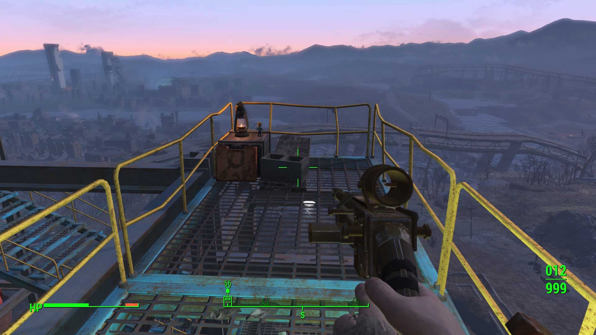 Verscholen op een sniper schuilplaats bij Corvega Assembly Plant. Zoek ten westen van het dungeon icoon op je map. Je moet veel trappen beklimmen en vijanden uitschakelen om hier te geraken.