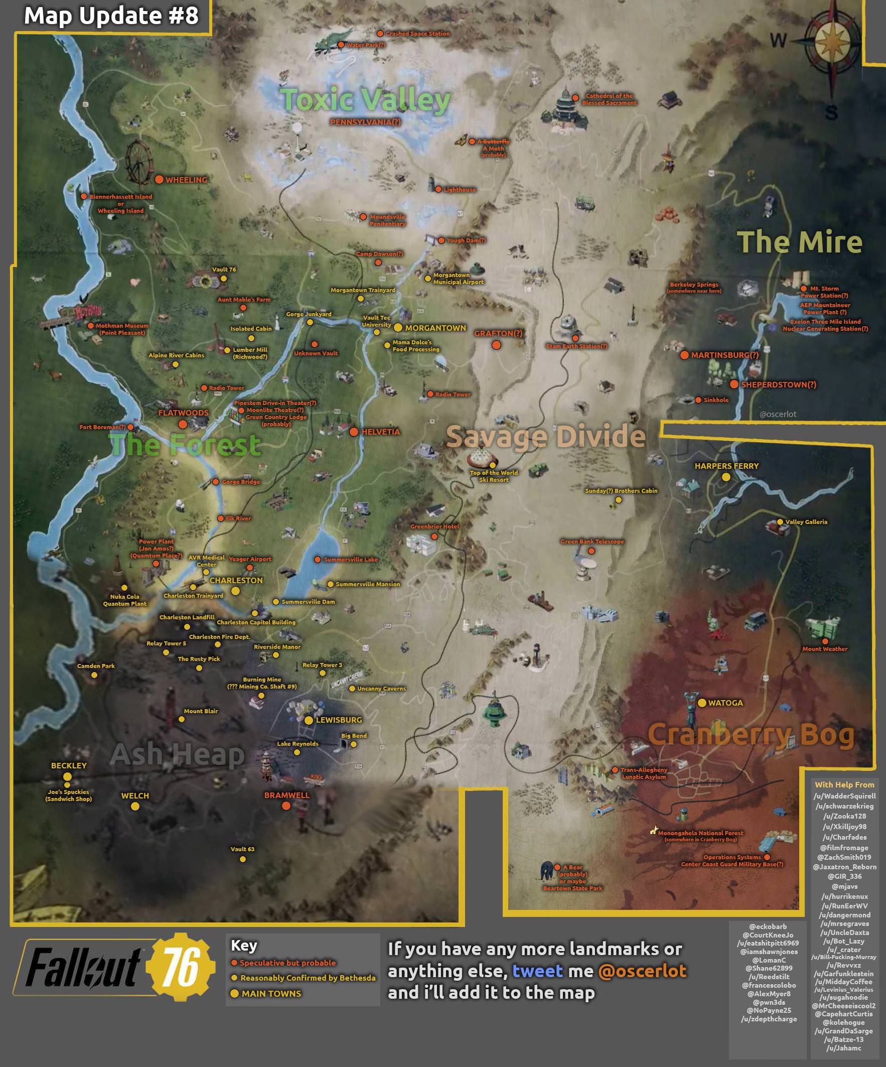 Reddit-gebruiker Oscerlot en andere fans hebben ondertussen op basis van screenshots en aanwijzingen een kaart in elkaar geknutseld. Vault 76 bevindt zich linksboven op de kaart tussen The Forest en Toxic Valley. Volgens speculatie zijn Morgantown, West Union en Charleston de belangrijkste locaties die in de buurt liggen. Voor de rest bestaat de kaart uit de gebieden The Mire, Savage Divide, Ash Heap en Cranberry Bog. Enkele locaties zijn al door Bethesda bevestigd, maar houd er rekening mee dat locaties en plaatsnamen tijdens de ontwikkeling van de game kunnen veranderen.