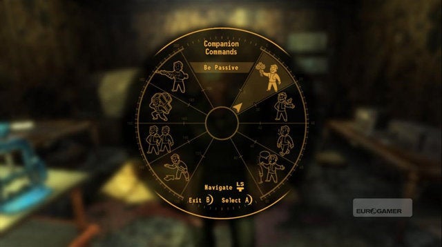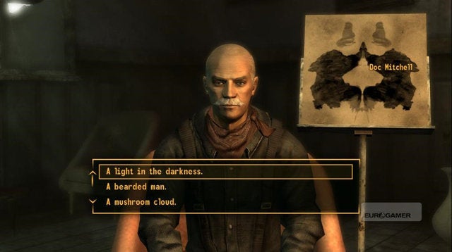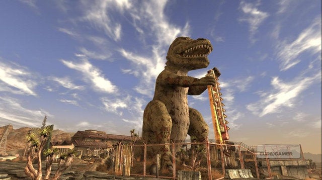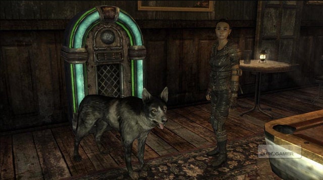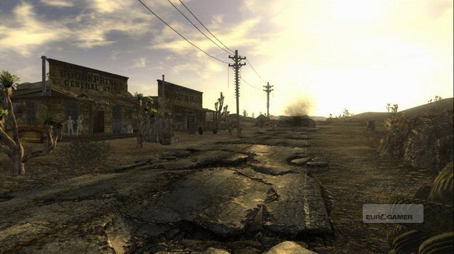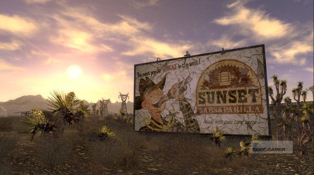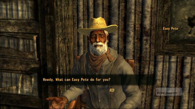 Bij het betreden van de buitenwereld overvalt me, vreemd genoeg, hetzelfde gevoel toen ik Vault 101 verliet. Voor mij strekt er een wijde wereld zich uit die tegelijk bruist van het leven en toch heel verlaten oogt door een gure wind en tumbleweed dat her en der over het landschap rolt. Na Fallout 3 dacht ik dat gevoel reeds overmeesterd te hebben, en toch kreeg ik meteen zin om er op uit te trekken. Het helpt trouwens enorm dat Goodsprings zich bevindt op een heuvel waardoor je vanaf het begin op een schitterend panorama getrakteerd wordt. Maar zomaar erop uit gaan is niet aangeraden, zeker niet voor wie nog nooit een Fallout-game in handen heeft gehad. Dankzij een vriendelijke baruitbaatster krijg ik de kans om met een vuurwapen te jagen op klein wild en de controls terug onder de knie te krijgen. En terwijl verdien ik nog even wat zogenaamde caps wat nooit kwaad kan (caps of bierdopjes zijn de munteenheid in de Fallout-wereld).