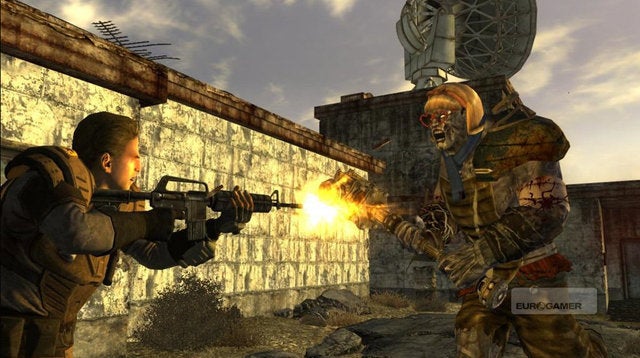 Men windt er geen doekjes om bij het starten van de game; je belandt in een zeer benarde situatie en het ziet er naar uit dat het eindscherm ironisch genoeg zo dadelijk op het scherm zal verschijnen. Vier jaar na de gebeurtenissen uit Fallout 3 (we spreken dan over 2281) wordt het naamloze personage, waarmee je de Wasteland kan verkennen, geëxecuteerd met een schot tussen de ogen in een vers gedolven graf. De koerier moest aanvankelijk een pakje afleveren, maar werd gedwarsboomd door een mysterieuze bende geleid door een man met een geruit hemd. Dat bord met spek en eieren moet die ochtend wonderen gedaan hebben, want wonder bij wonder overleeft onze protagonist de aanval. Een zwervende robot vindt de onfortuinlijke held en brengt hem bij de dokter van het kleine dorpje, Goodsprings. Na de gewoonlijke samenstelling van het personage mogen we dan uiteindelijk op stap om uit te zoeken in welke rotzooi we verzeild geraakt zijn en waarom onze dood zo gewenst was.