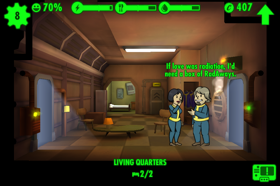 In de kern is Fallout Shelter geen revolutionaire game. Je bouwt een basis met verschillende kamers. Deze kamers genereren levensmiddelen voor je inwoners die je na korte wachttijden verzamelt. Gelukkige inwoners leveren meer geld en uitrusting op. Meer geld investeer je in extra kamers. Korte speelsessies waarbij je enkele beslissingen neemt en je smartphone terug op zak steek. Kortom, dezelfde verslavende cyclus zoals bijvoorbeeld in Tiny Tower of Clash of Clans.