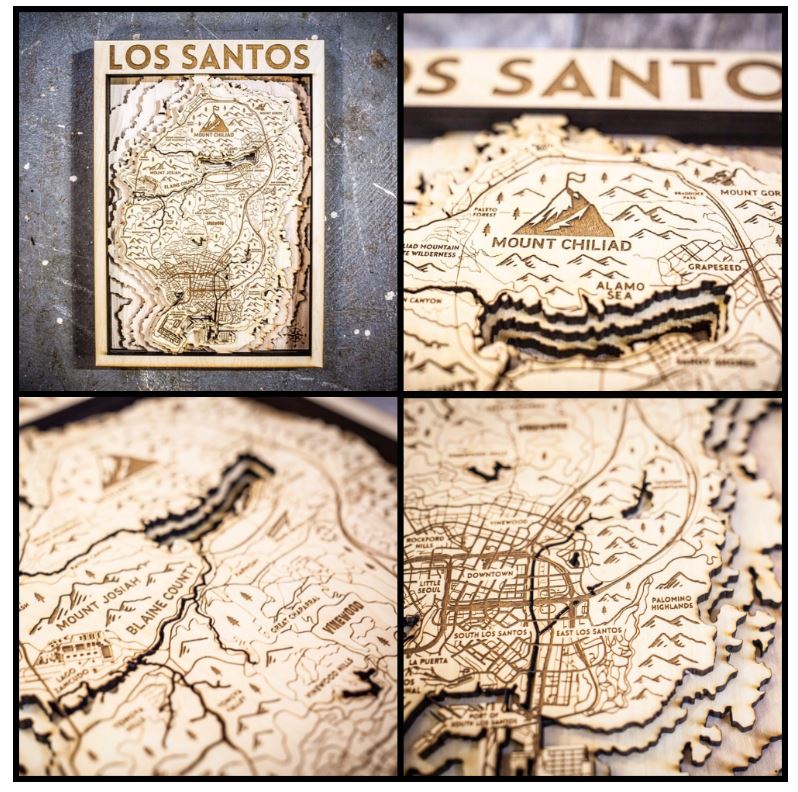 Ontwerper Originartwork deelt zijn uit hout gesneden versie van de Los Santos-map via Reddit. De map is erg gedetailleerd en bevat alle straten, bezienswaardigen en namen. Nog indrukwekkender zijn de ingekerfde lagen die de hoogteverschillen aanduiden en de illustraties die het geheel aankleden.