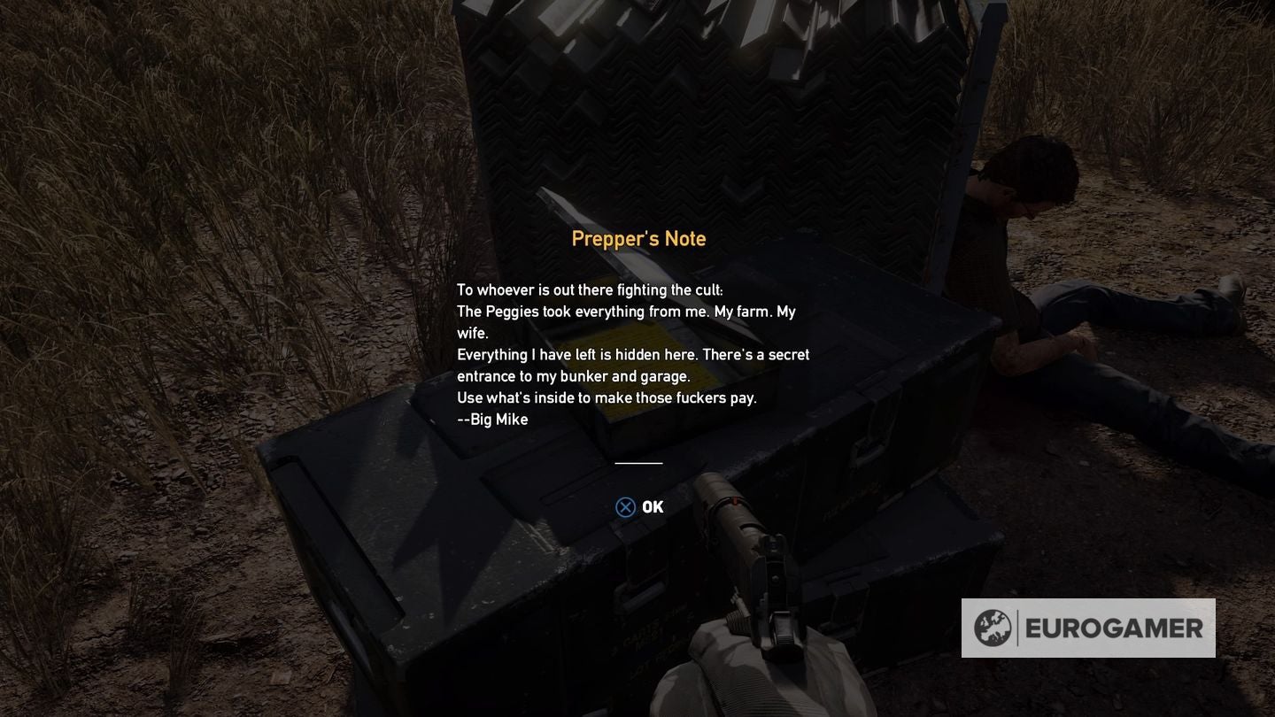 Wanneer je bij het gebouw arriveert, zoek je naar een Prepper Stash briefje op de dozen die voor het gebouw staan. Normaal ligt er een lijk vlakbij. Nu moet je uitvogelen hoe je in het gebouw zonder ramen of deuren geraakt. Tijd om wat creatief te worden.