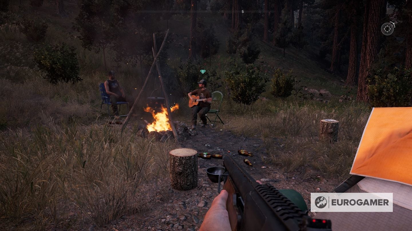Aan de linkerkant van de rivier zal je een paar NPC's zien kamperen. Eén van hen heeft een hint naar de Prepper Stash.