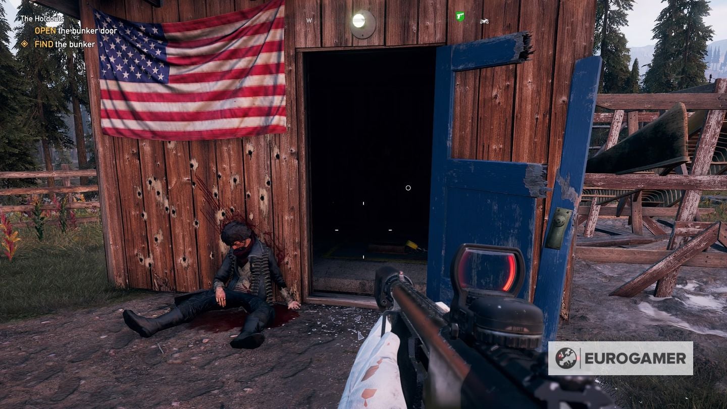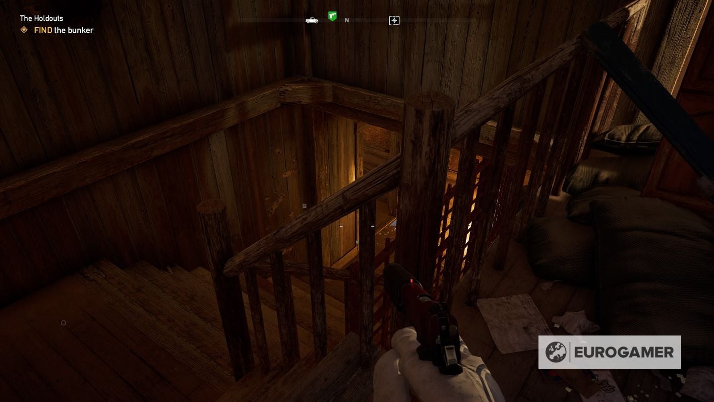 De bunker ligt aan de linkerzijde van het huis (als je naar de voorkant van het huis kijkt). Er hangt een amerikaanse vlag buiten en tegen de deur ligt een dode cultist. Schiet het slot kapot, open het luik en klim naar beneden. Gebruik de keycard op de gesloten deur en grijp je buit!