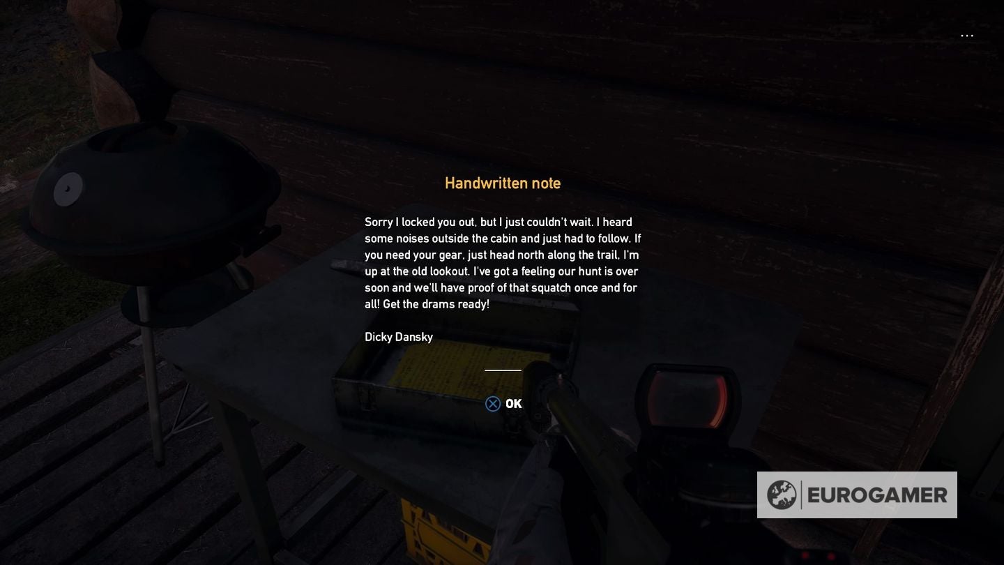 Schakel hem uit en ga naar de voorkant van het huisje, waar je de hint voor de Prepper Stash vindt. De sidequest start nu.