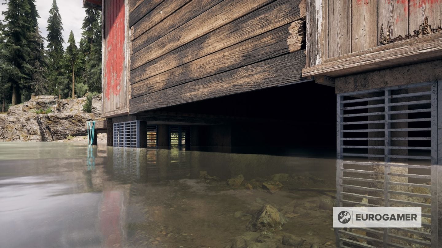Wanneer je de voorkant ziet, zwem je door het gat en je kunt de boothuis in. Klim rechts omhoog en je ziet een gele schakelaar op de muur. Activeer deze en je kunt het boothuis verlaten via de deur die nu open is. Nu start de volgende fase voor deze Prepper Stash.