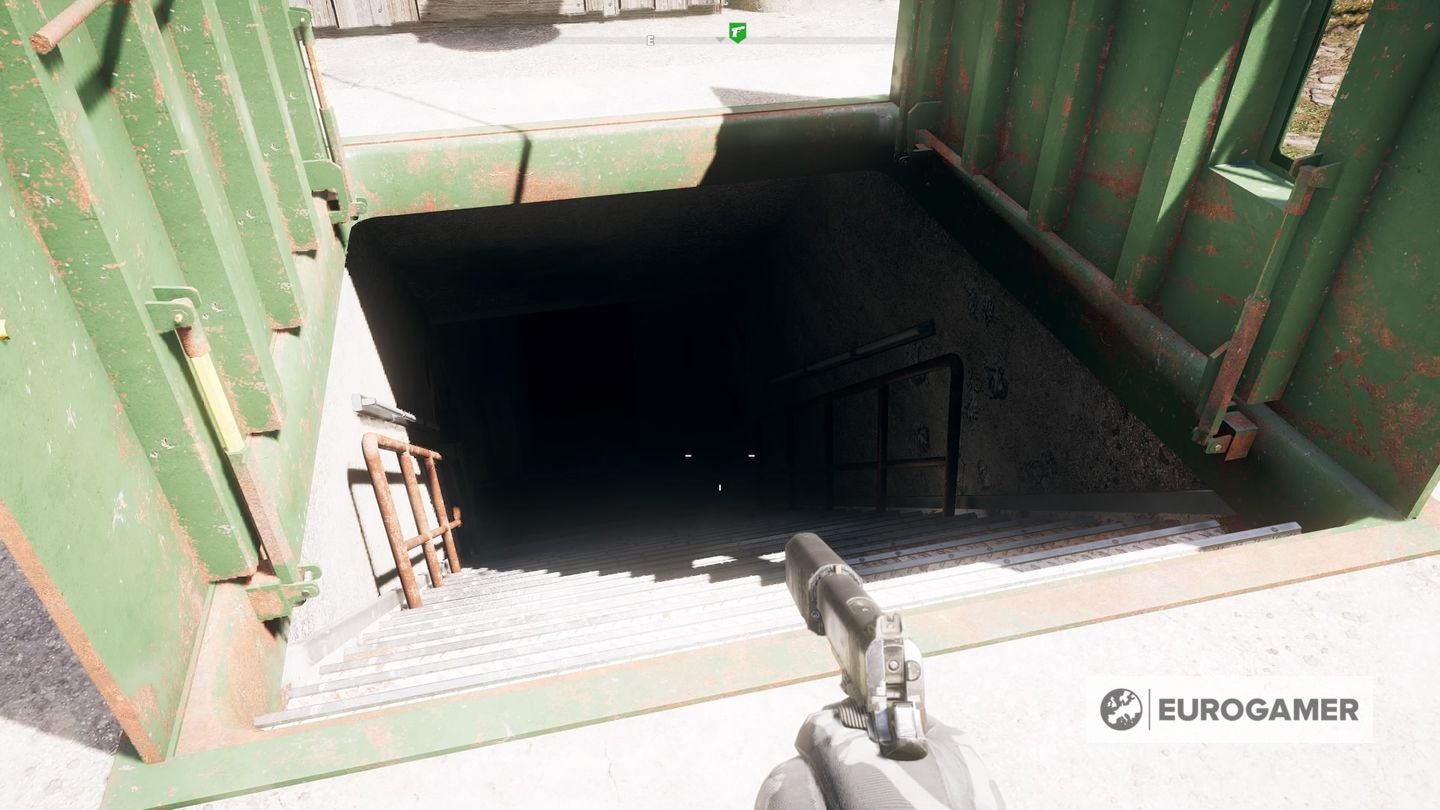 Je moet nu de heuvel oplopen naar de kleinere hut en aan het gele wiel draaien links van het gebouw. Het water in de bunker onder je zal nu wegvloeien. Open de hatch naast je, ga de trap omlaag en je kan de bunker in gaan.