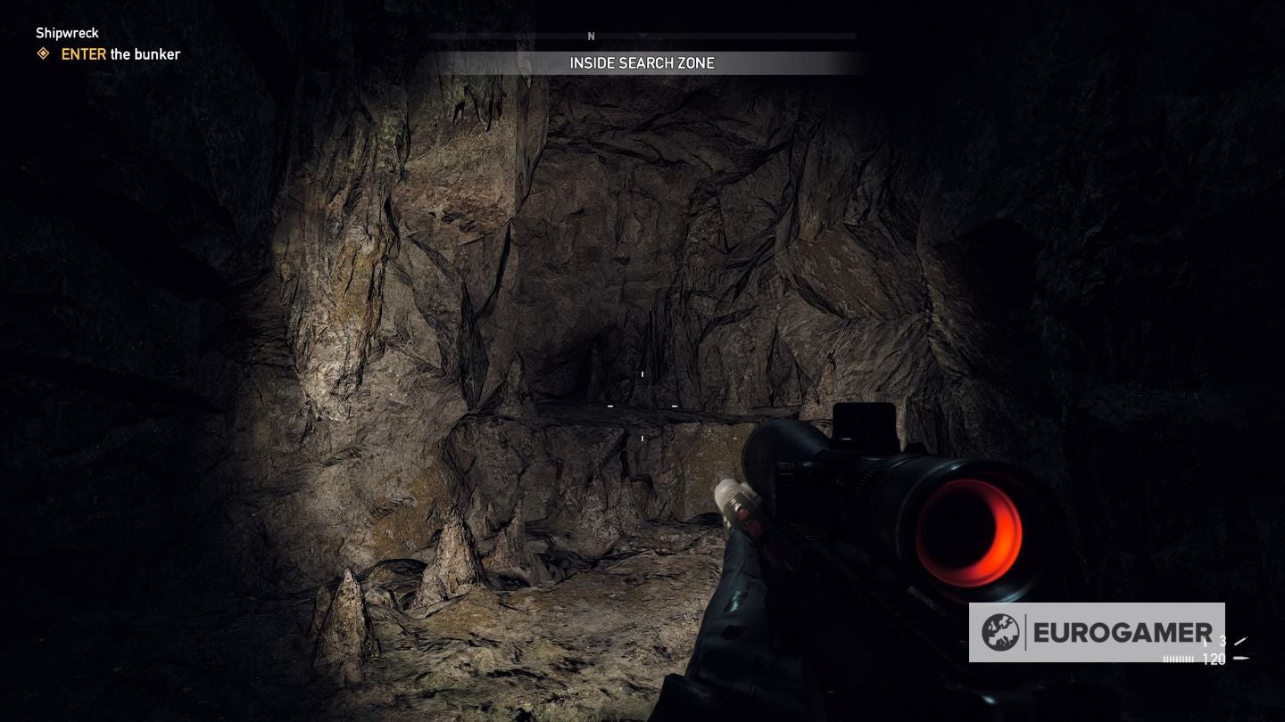 Klim eruit, ga naar links en je vindt jezelf in een klein stuk water. Zwem erdoor naar een langere tunnel onderwater. Wanneer je een blauwe draad ziet voor je grappling hook kijk je naar boven om een luik te zien. Duw het open en klim eruit. Je bent nu in een bunker.