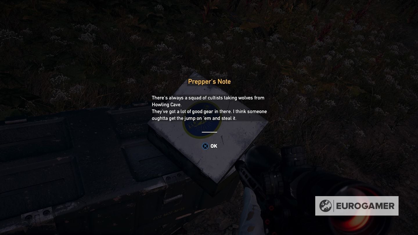 De doos met de notitie ligt vlak naast hem. Lees de nota en activeer de quest. Ga terug naar de grot. Equip een goeie shotgun of boog voor je binnengaat.