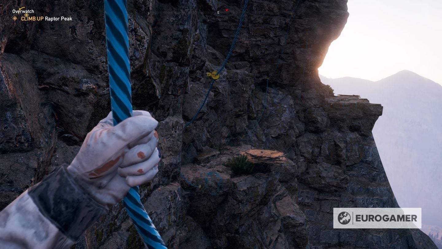 Je hebt een laatste grapple nodig om de top te bereiken. Daar zie je ook kampeerder die tegen arenden vechten. Deze blijven spawnen, dus je kunt hier hun items farmen of gewoon doorgaan naar de Prepper Stash die voorbij hun tenten ligt.
