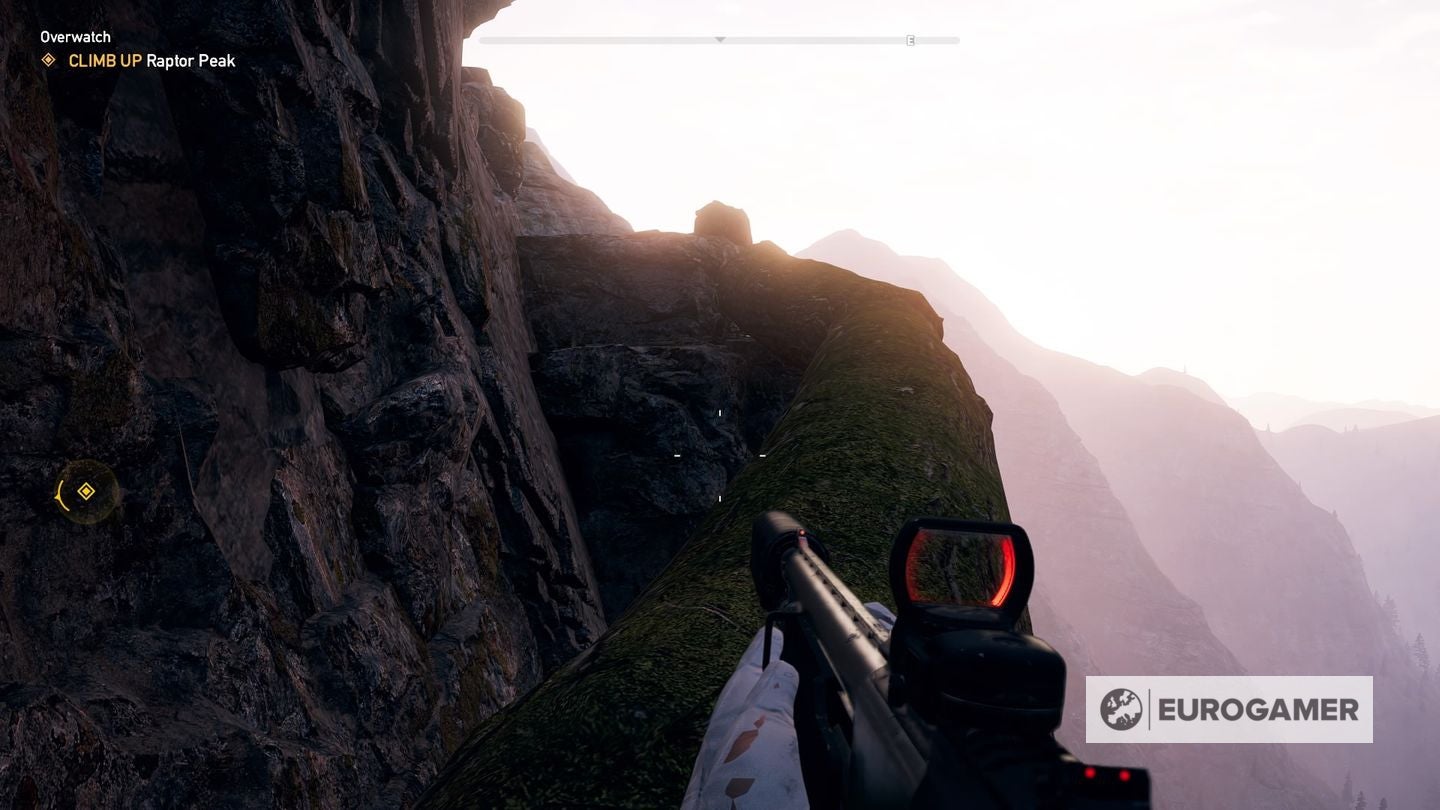 Volg het pad naar de voet van de berg, spring naar de overkant en gebruik je grappling hook. Er zijn heel wat richels nabij het arendsnest. Kruip ook onder de ene richel vooral je een grapple naar de volgende lijn uitvoert.