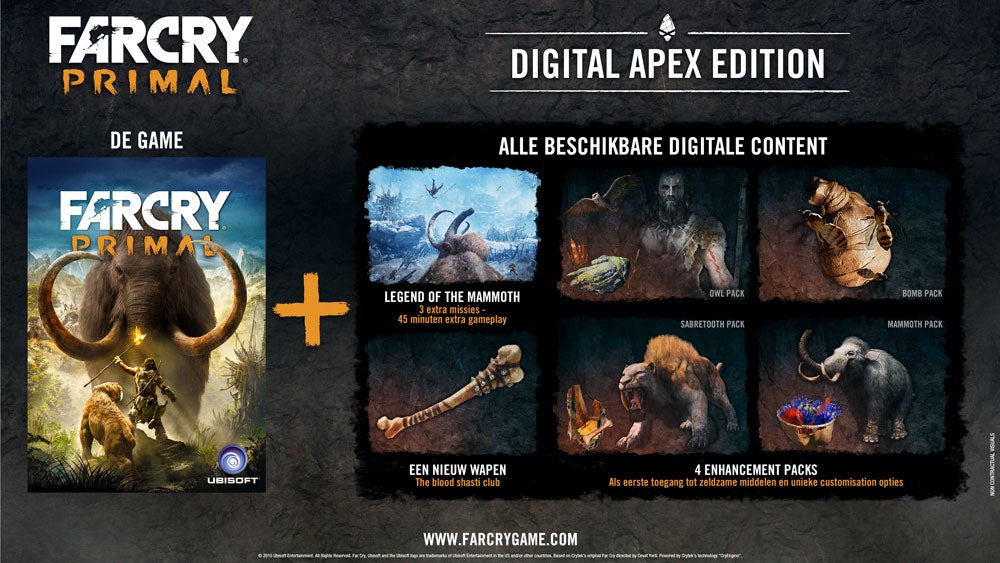 Far Cry Primal komt op 23 februari voor de PlayStation 4 en de Xbox One uit. De pc-versie volgt op 1 maart. De Far Cry Primal systeemeisen voor de pc-versie zijn inmiddels ook bekend. Naast de reguliere uitgave zijn er twee speciale edities van Far Cry Primal: de Special Edition en Collector's Edition. Er is ook een speciale digitale uitgave genaamd de Apex Edition die alle digitale content bevat.