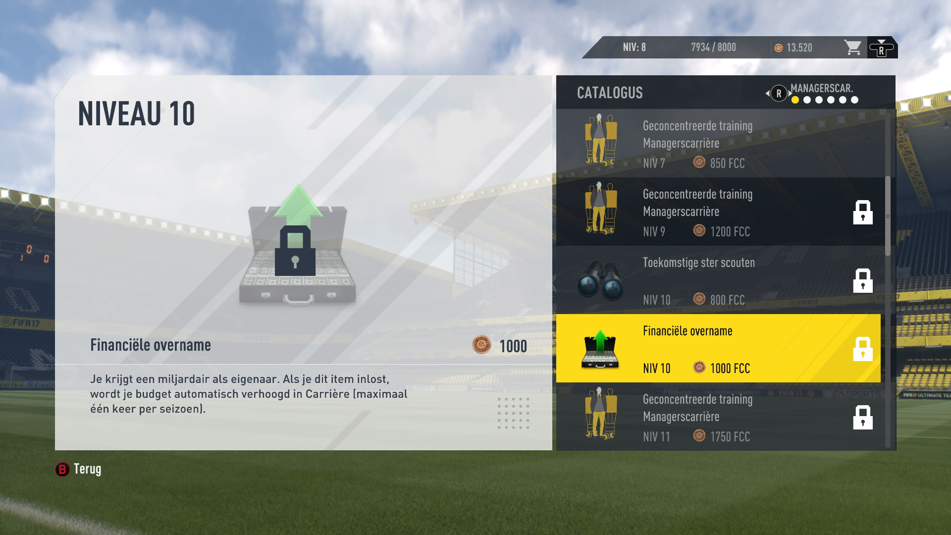 Afhankelijk van het level van de overname krijg je enkele miljoenen op je rekening gestort. Een ideale boost aan het begin van je carrière om je selectie te versterken.